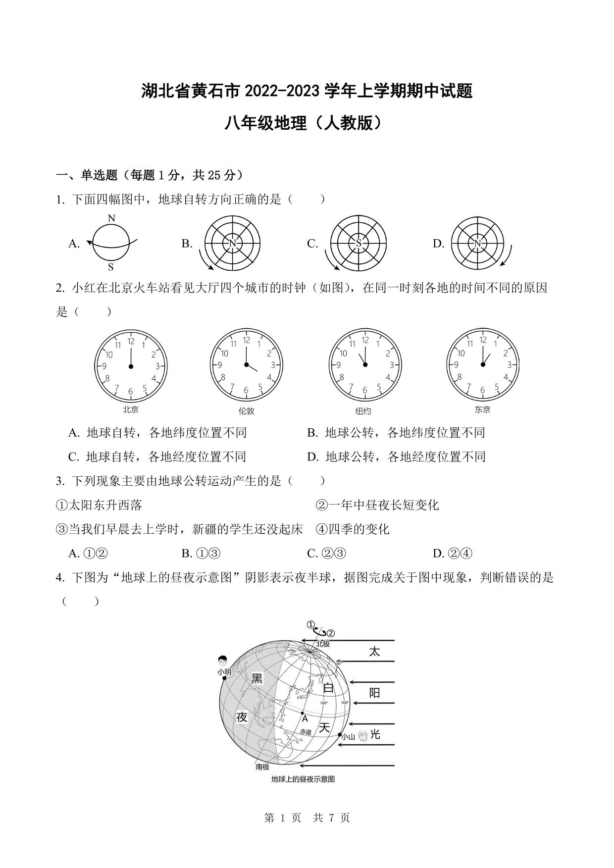 湖北省黄石市2022-2023学年上学期期中试题八年级地理(人教版)