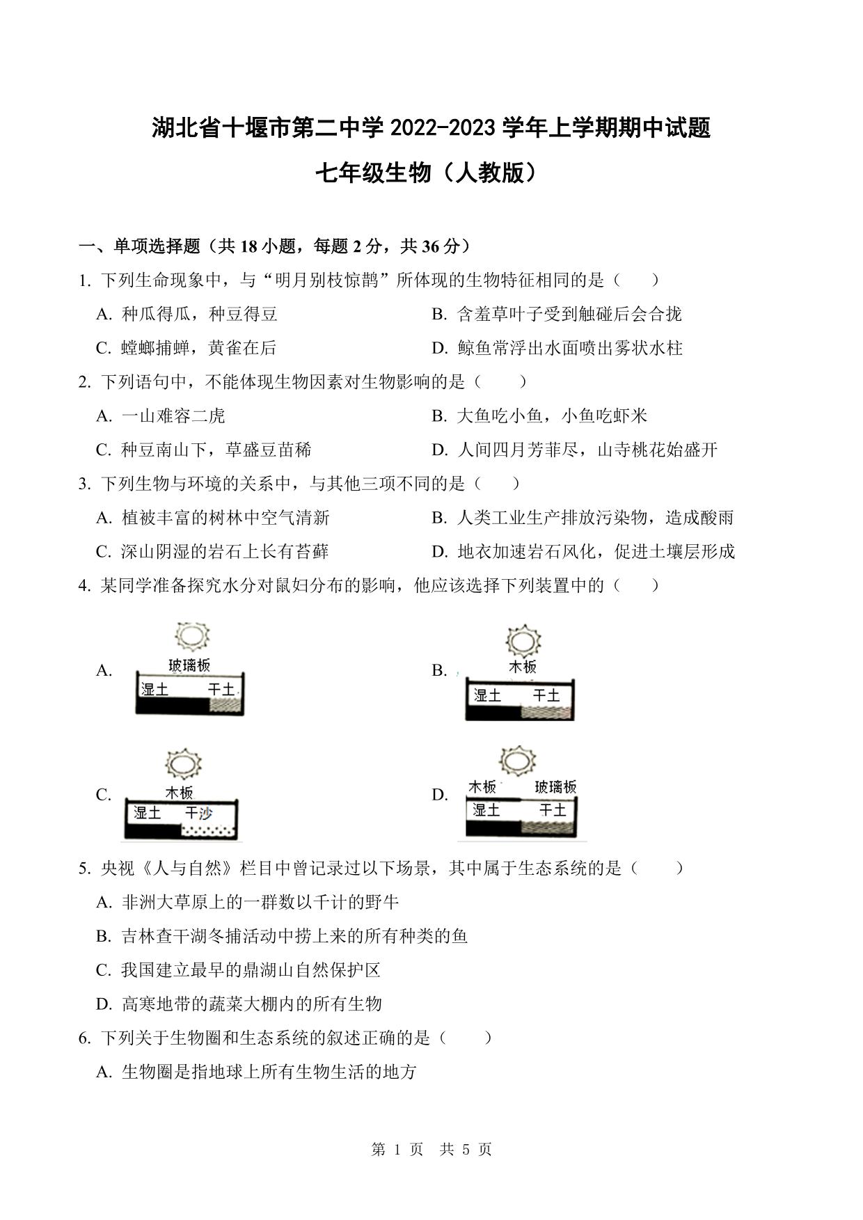 湖北省十堰市第二中学2022-2023学年上学期期中试题七年级生物(人教版)
