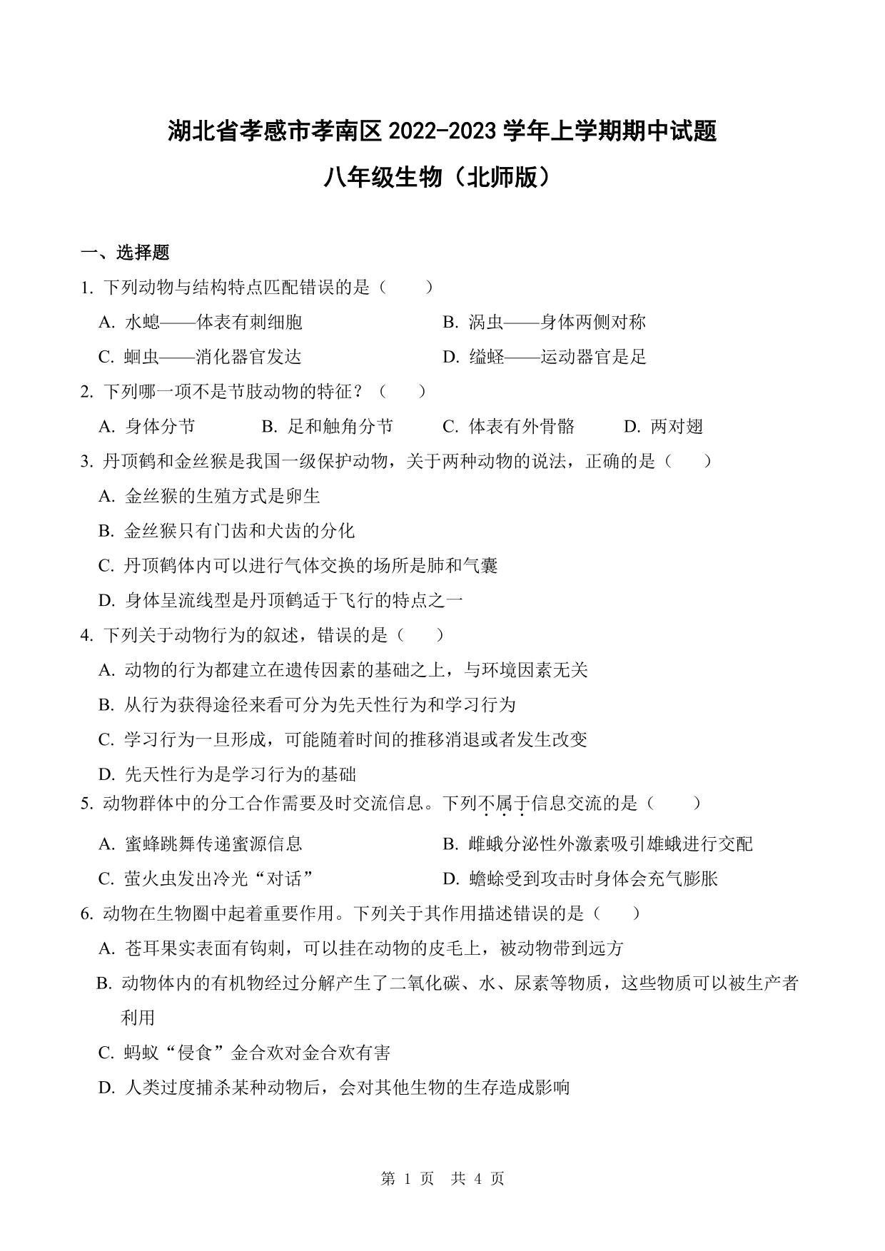 湖北省孝感市孝南区2022-2023学年上学期期中试题八年级生物(北师版)