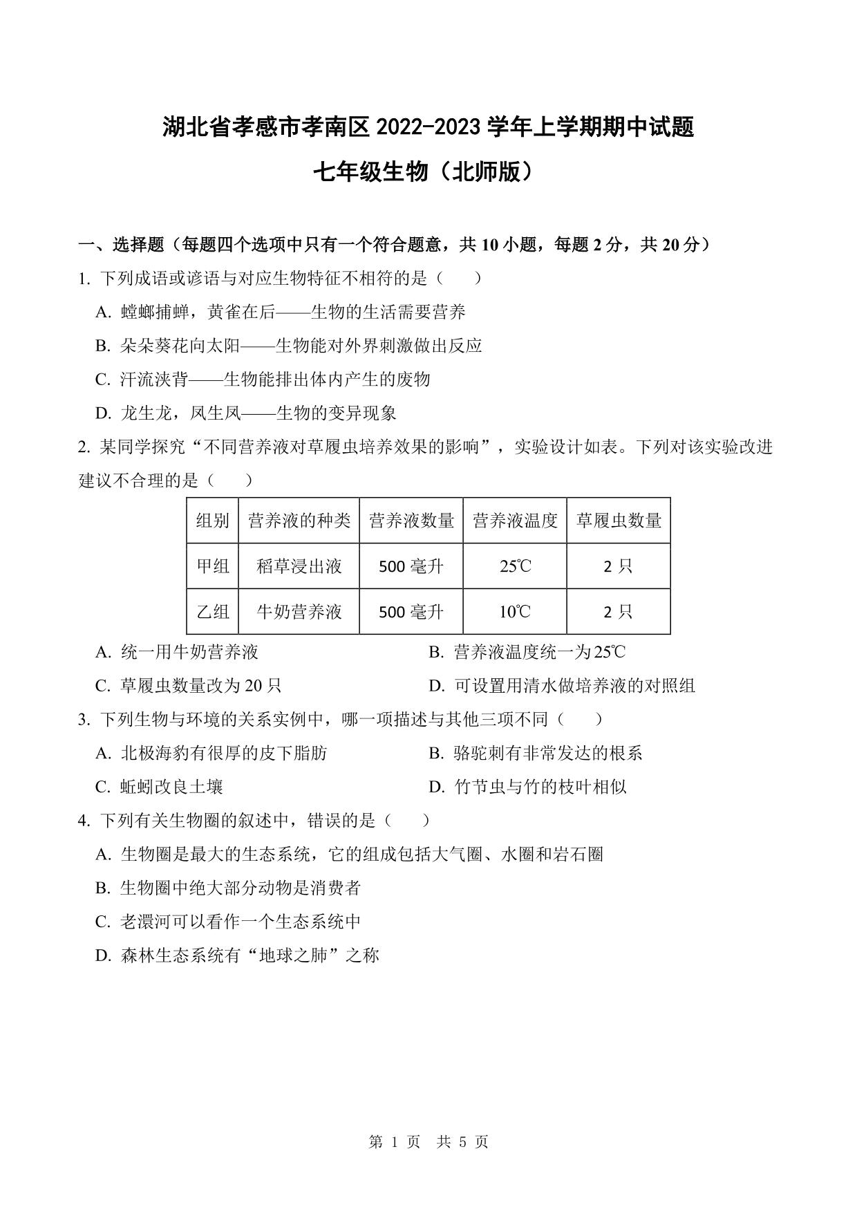 湖北省孝感市孝南区2022-2023学年上学期期中试题七年级生物(北师版)