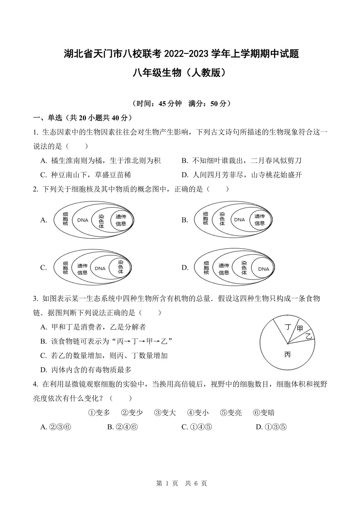 湖北省天门市八校联考2022-2023学年上学期期中试题八年级生物(人教版)