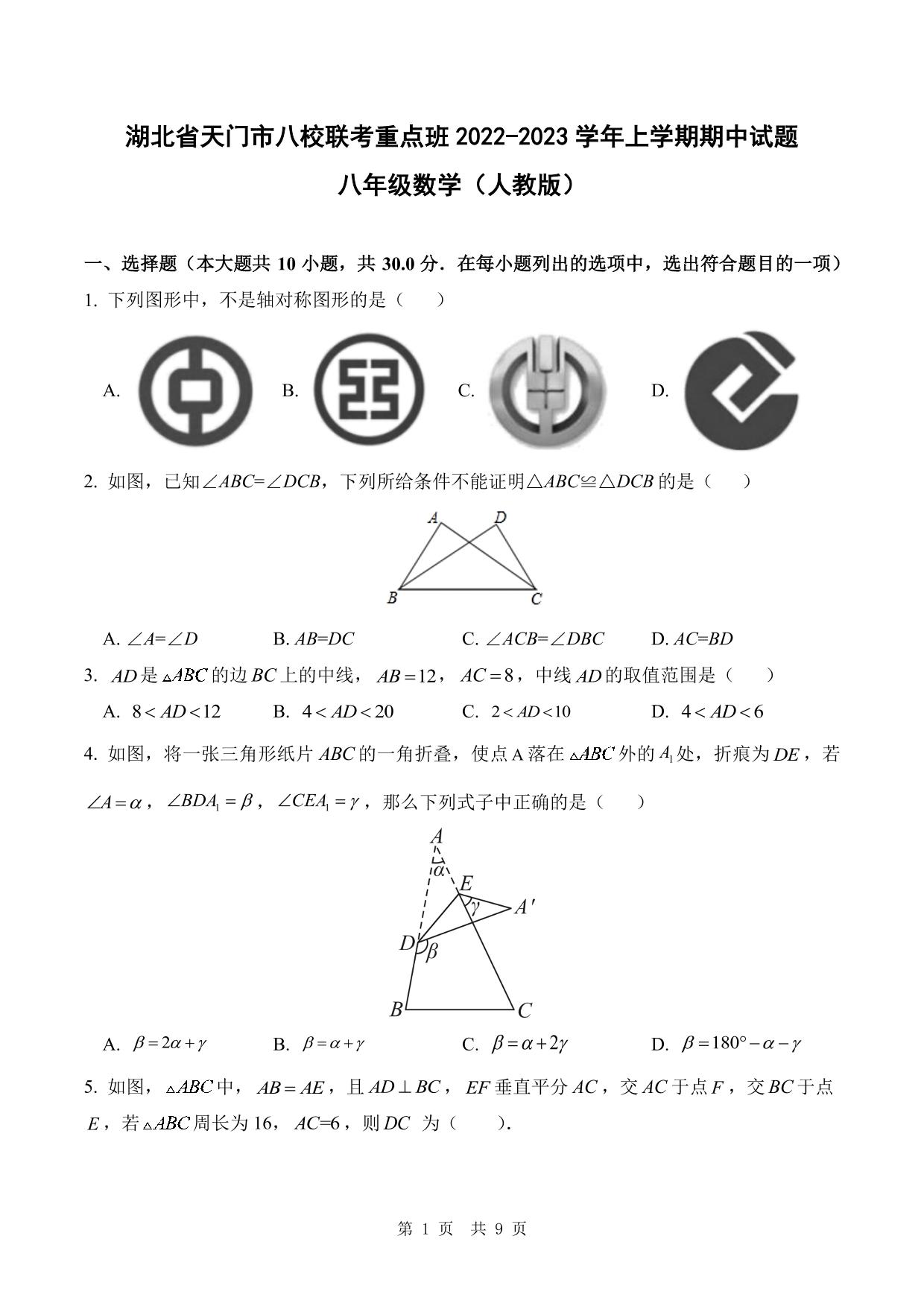 湖北省天门市八校联考重点班2022-2023学年上学期期中试题八年级数学(人教版)