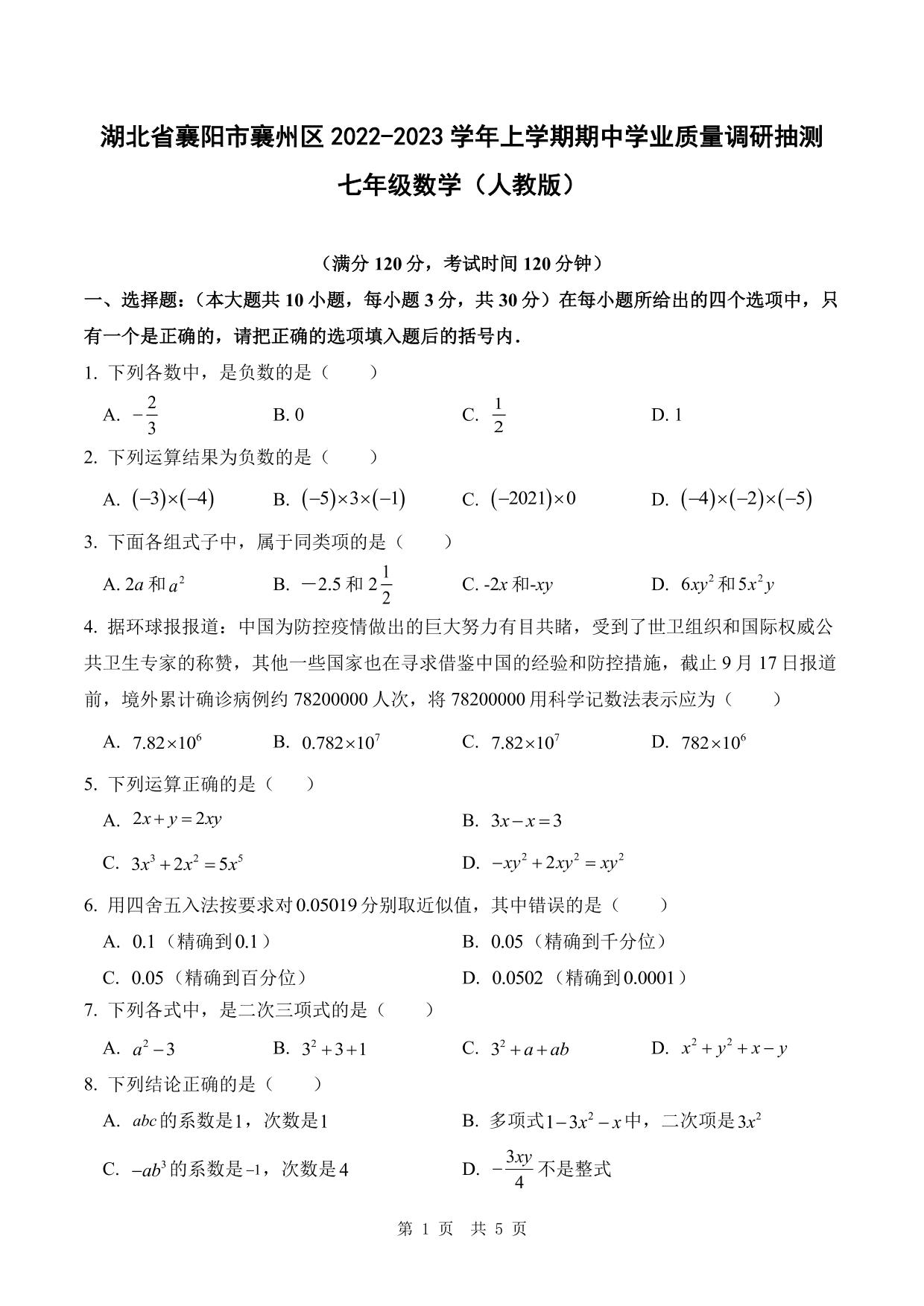 湖北省襄阳市襄州区2022-2023学年上学期期中学业质量调研抽测七年级数学(人教版)
