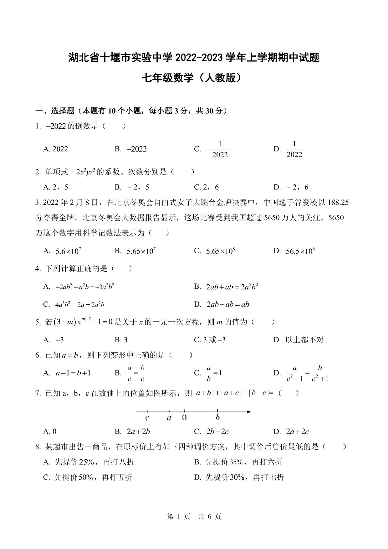 湖北省十堰市实验中学2022-2023学年上学期期中试题七年级数学(人教版)