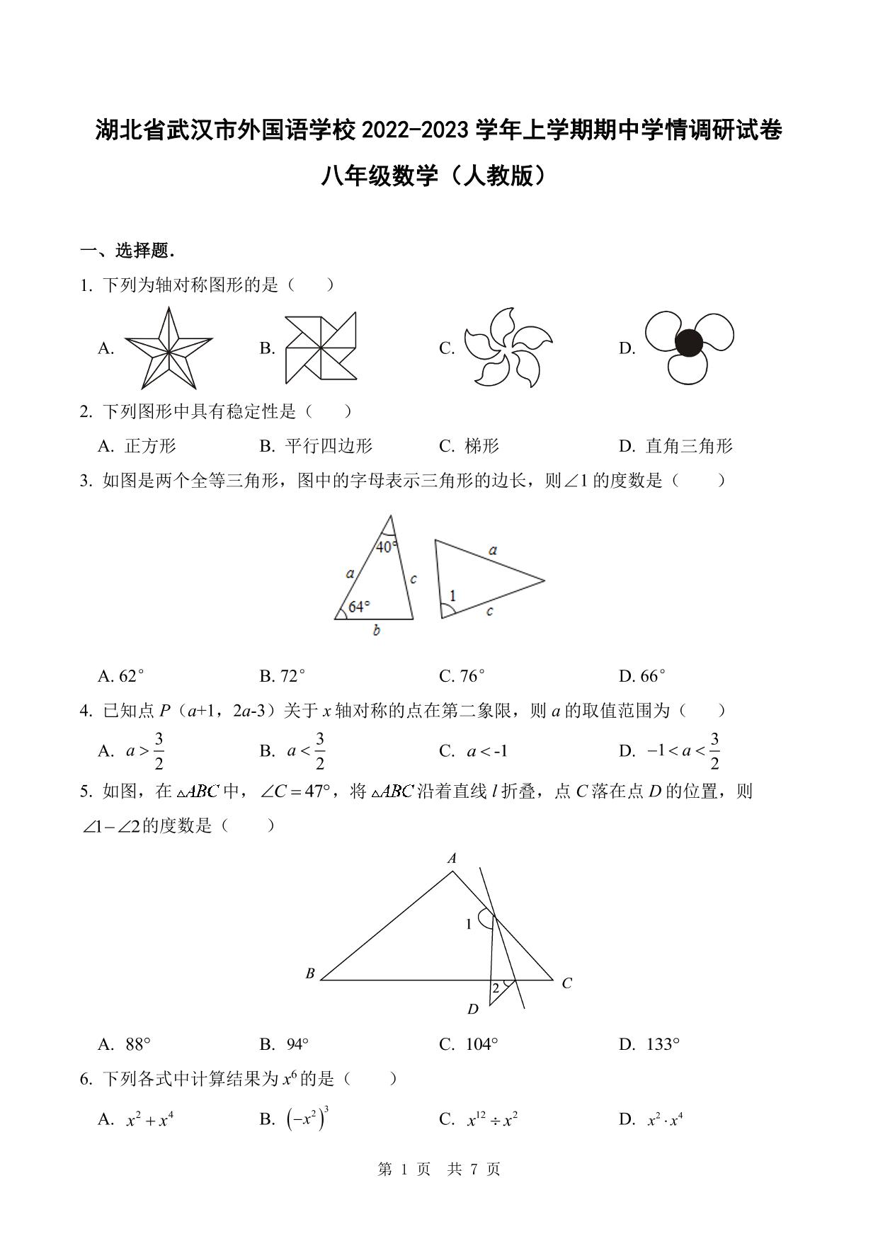 湖北省武汉市外国语学校2022-2023学年上学期期中学情调研试卷八年级数学(人教版)