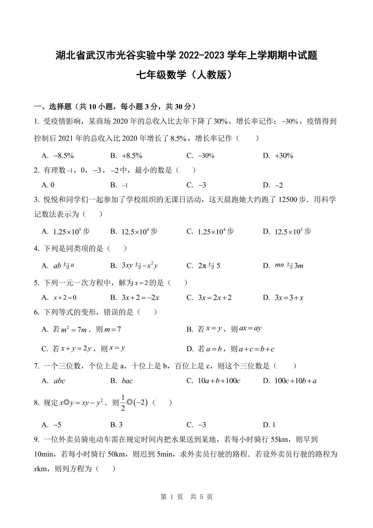 湖北省武汉市光谷实验中学2022-2023学年上学期期中试题七年级数学(人教版)