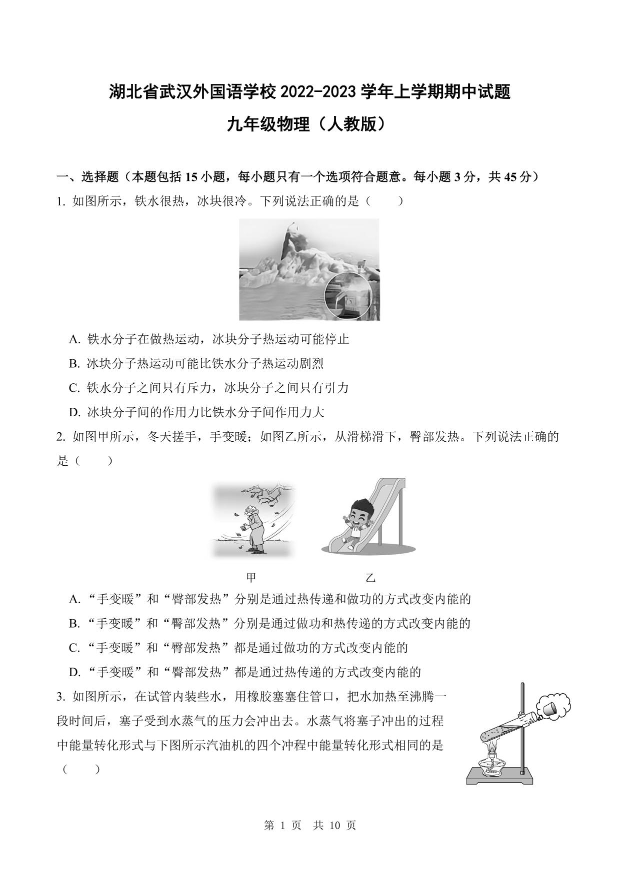 湖北省武汉外国语学校2022-2023学年上学期期中试题九年级物理(人教版)