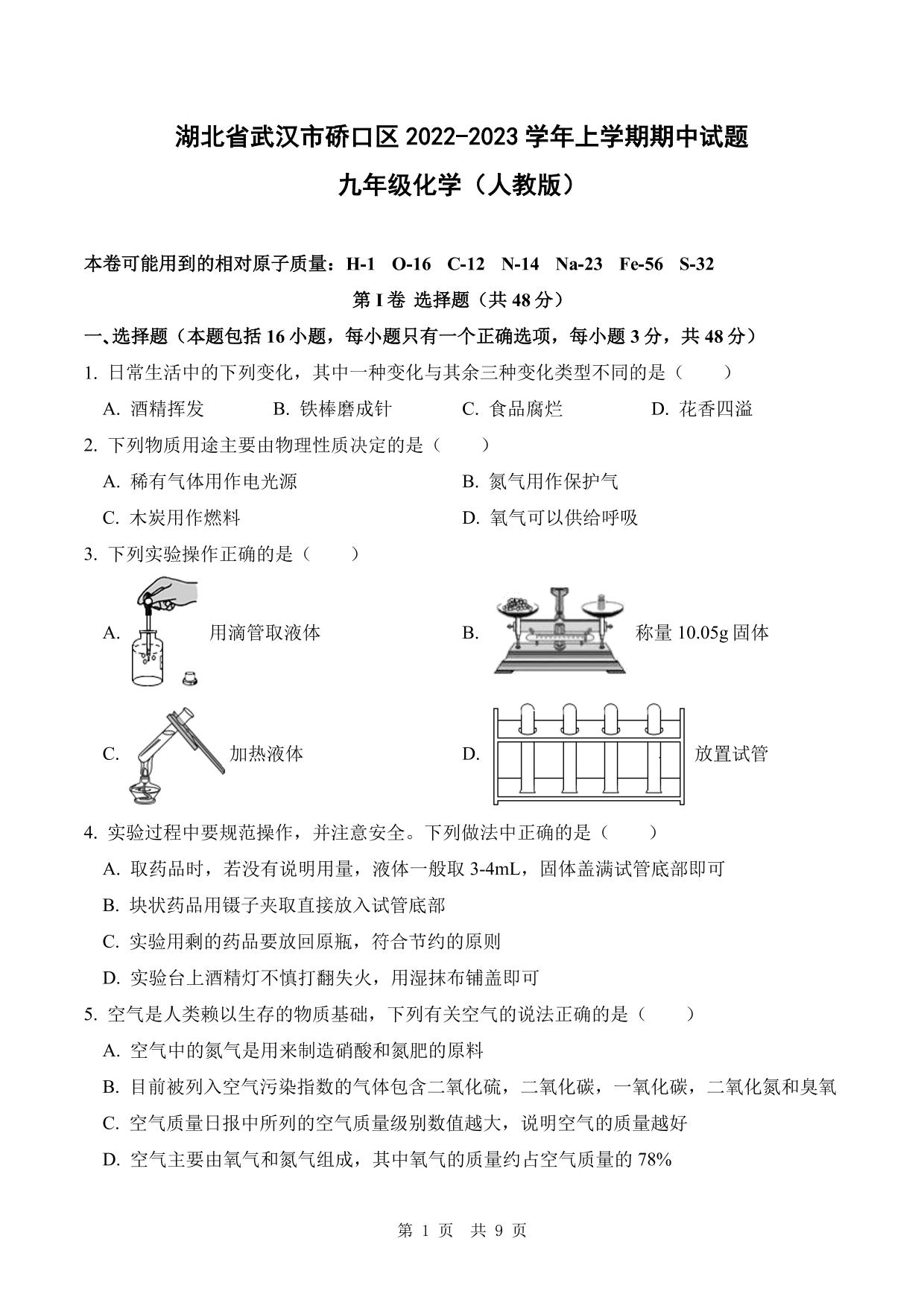 湖北省武汉市硚口区2022-2023学年上学期期中试题九年级化学(人教版)