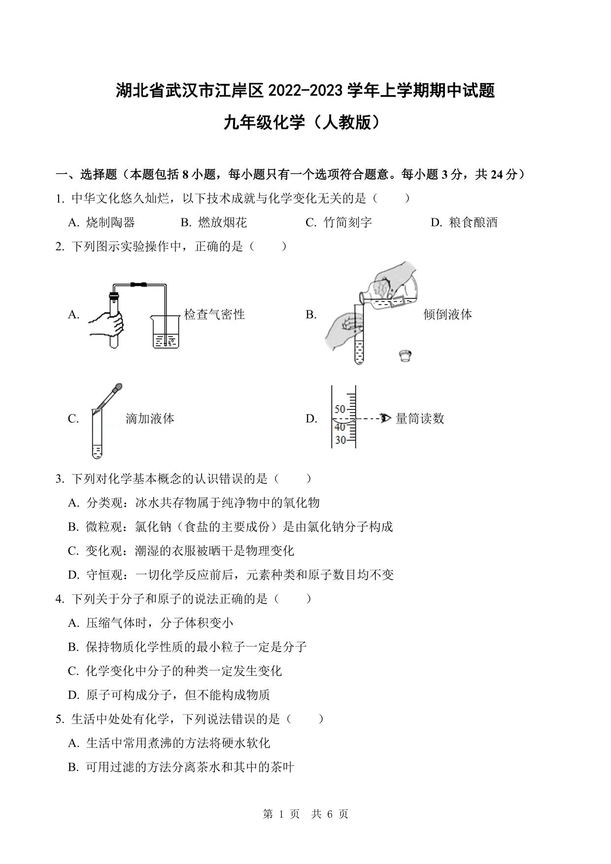 湖北省武汉市江岸区2022-2023学年上学期期中试题九年级化学(人教版)