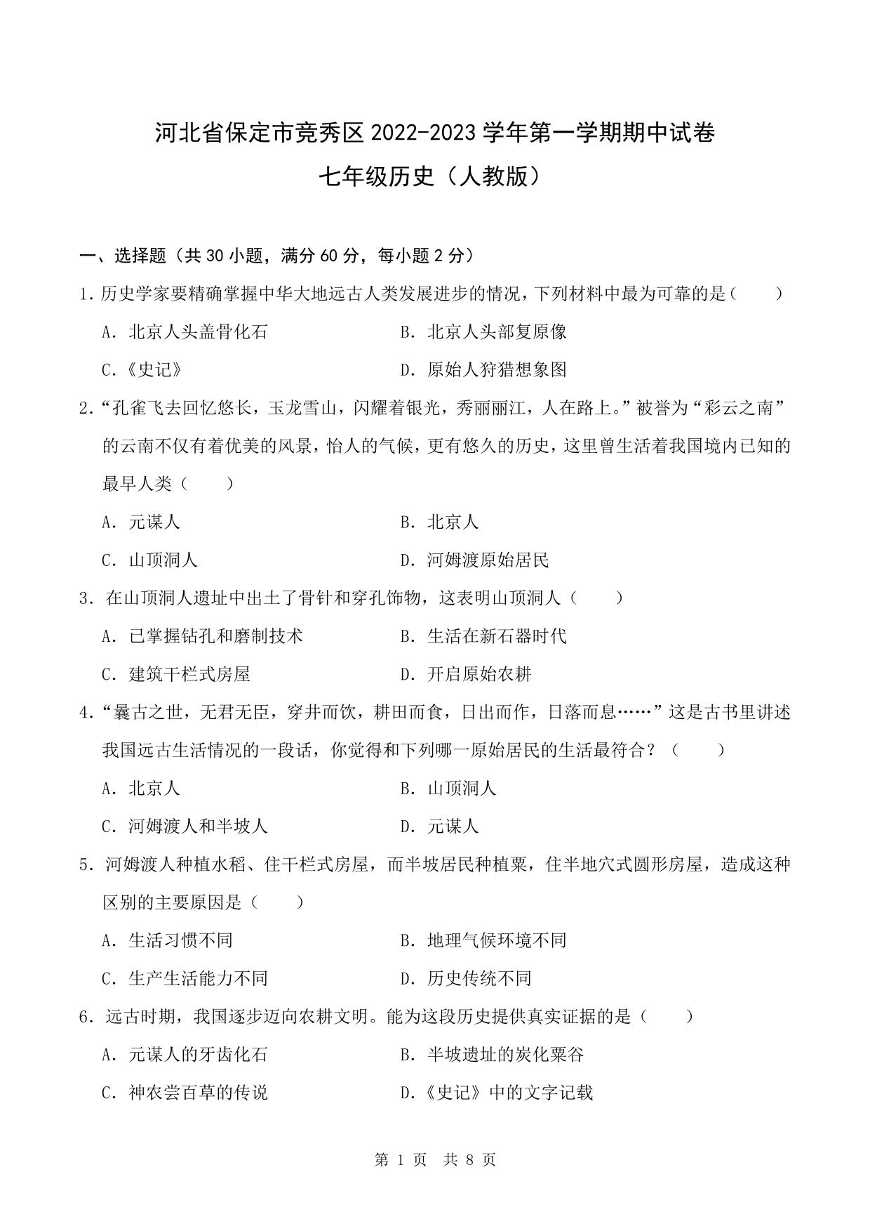河北省保定市竞秀区2022-2023学年第一学期期中试卷七年级历史(人教版)