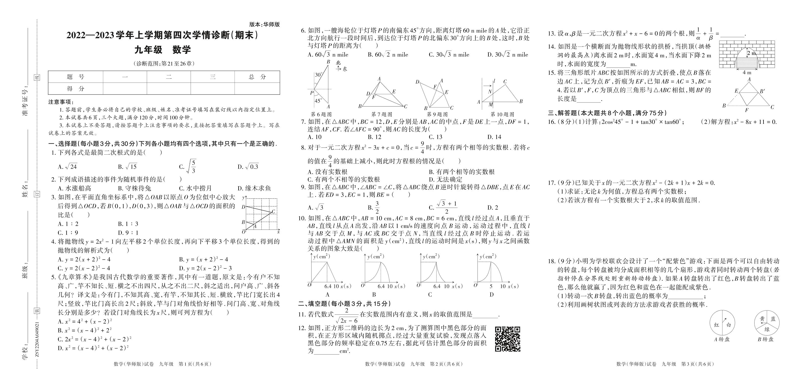河南省洛阳市宜阳县2022—2023学年上学期第四次学情诊断(期末)九年级数学(华师版)