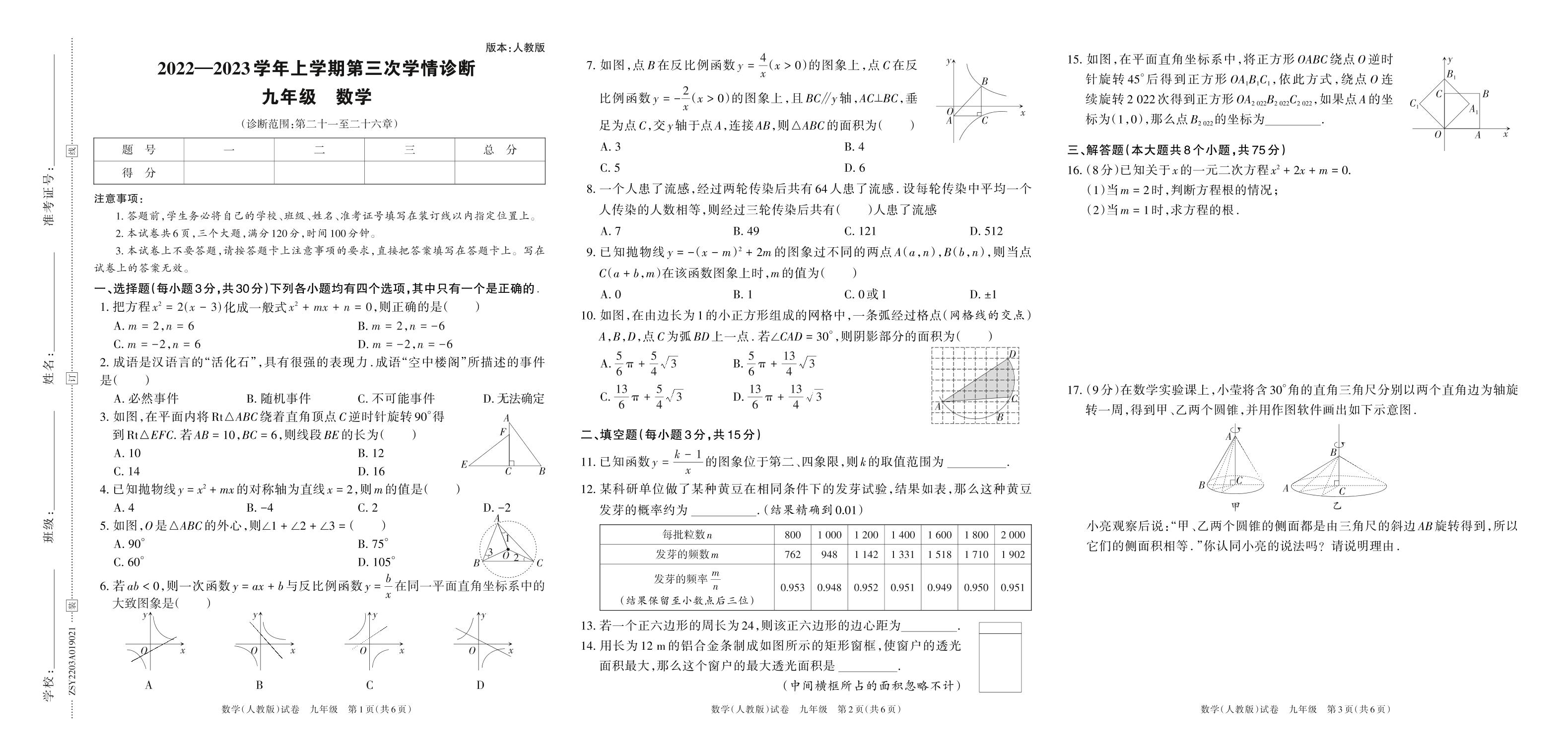 2022—2023学年上学期第三次学情诊断九年级数学(人教版)