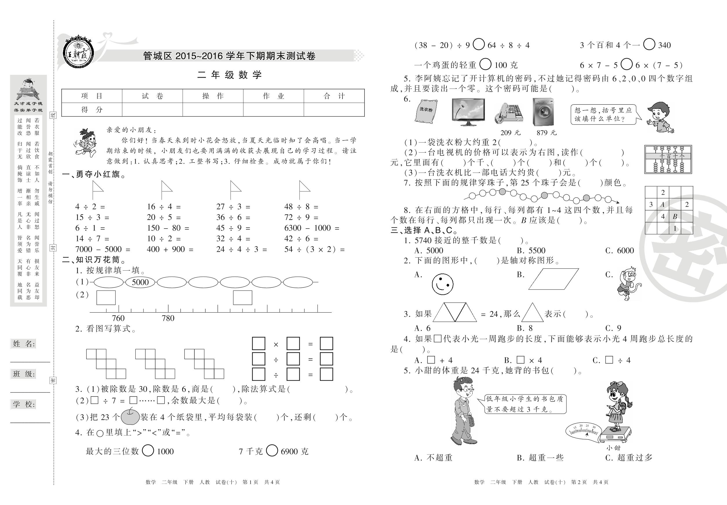 2015-2016学年第二学期郑州市管城区二年级数学试卷(人教版)【10】
