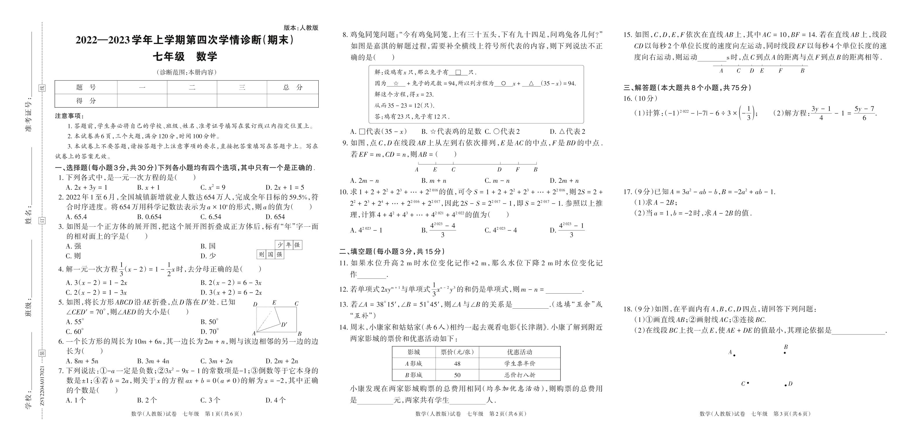 2022—2023学年上学期第四次学情诊断(期末)七年级数学(人教版)
