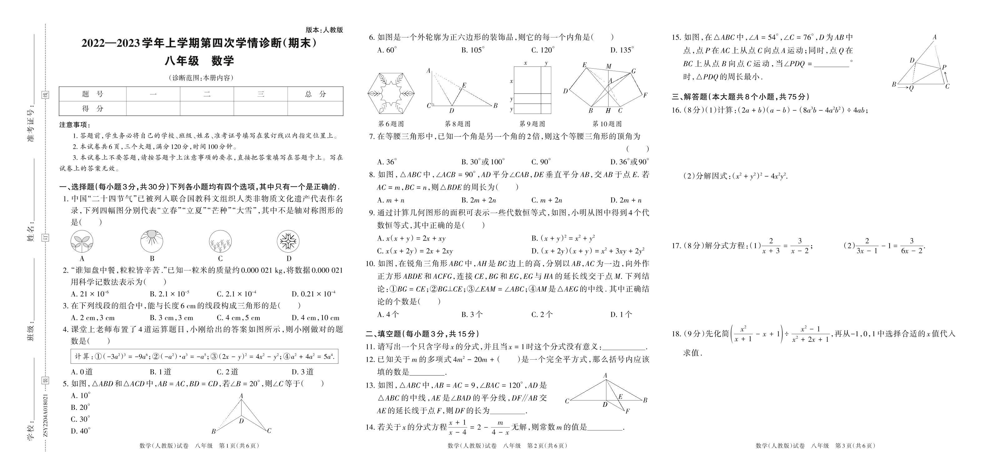 2022—2023学年上学期第四次学情诊断(期末)八年级数学(人教版)