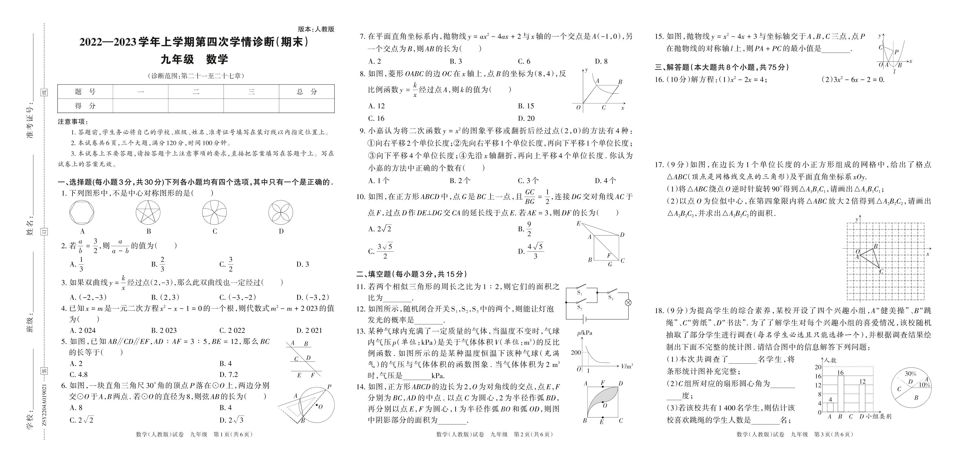 2022—2023学年上学期第四次学情诊断(期末)九年级数学(人教版)