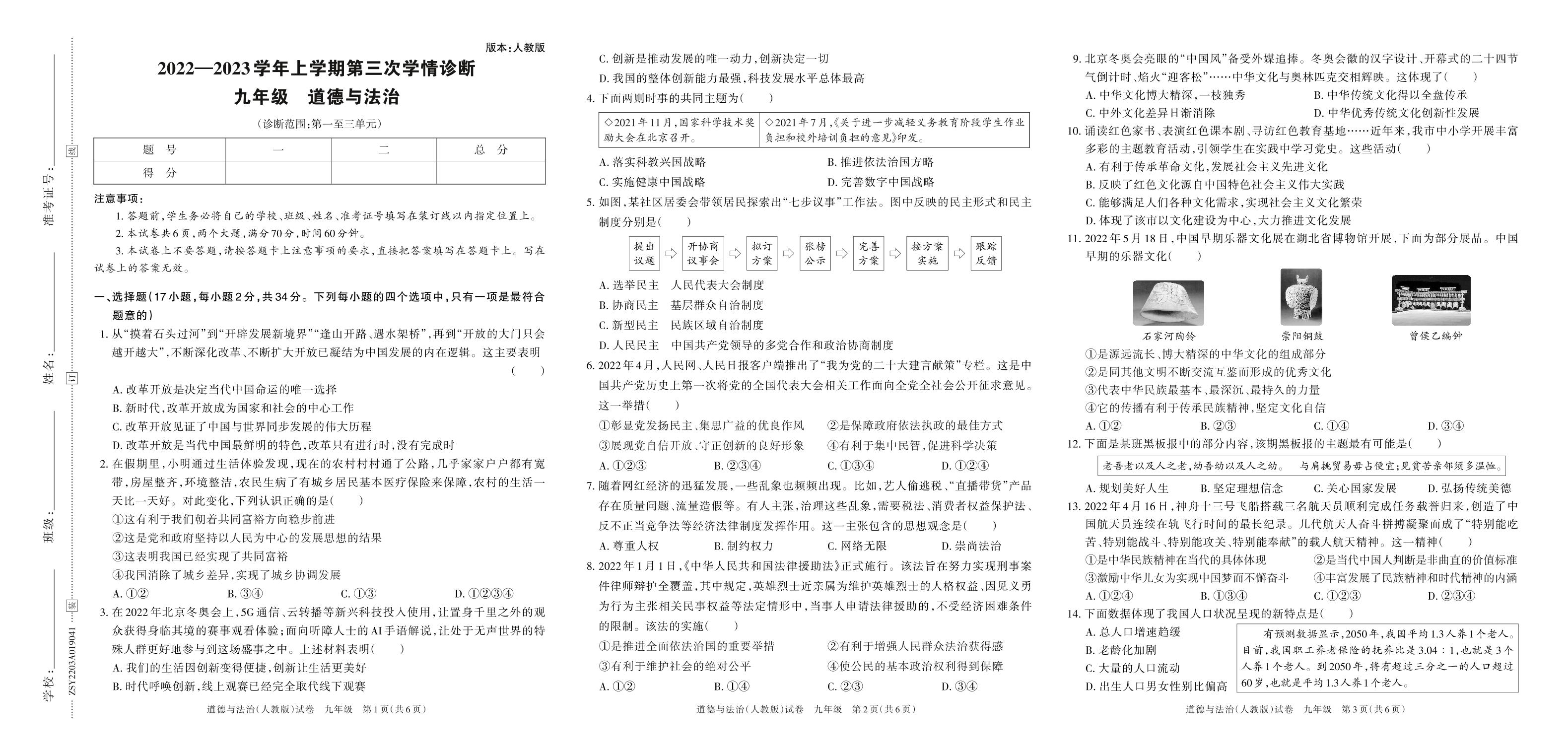 2022—2023学年上学期第三次学情诊断九年级道德与法治(人教版)