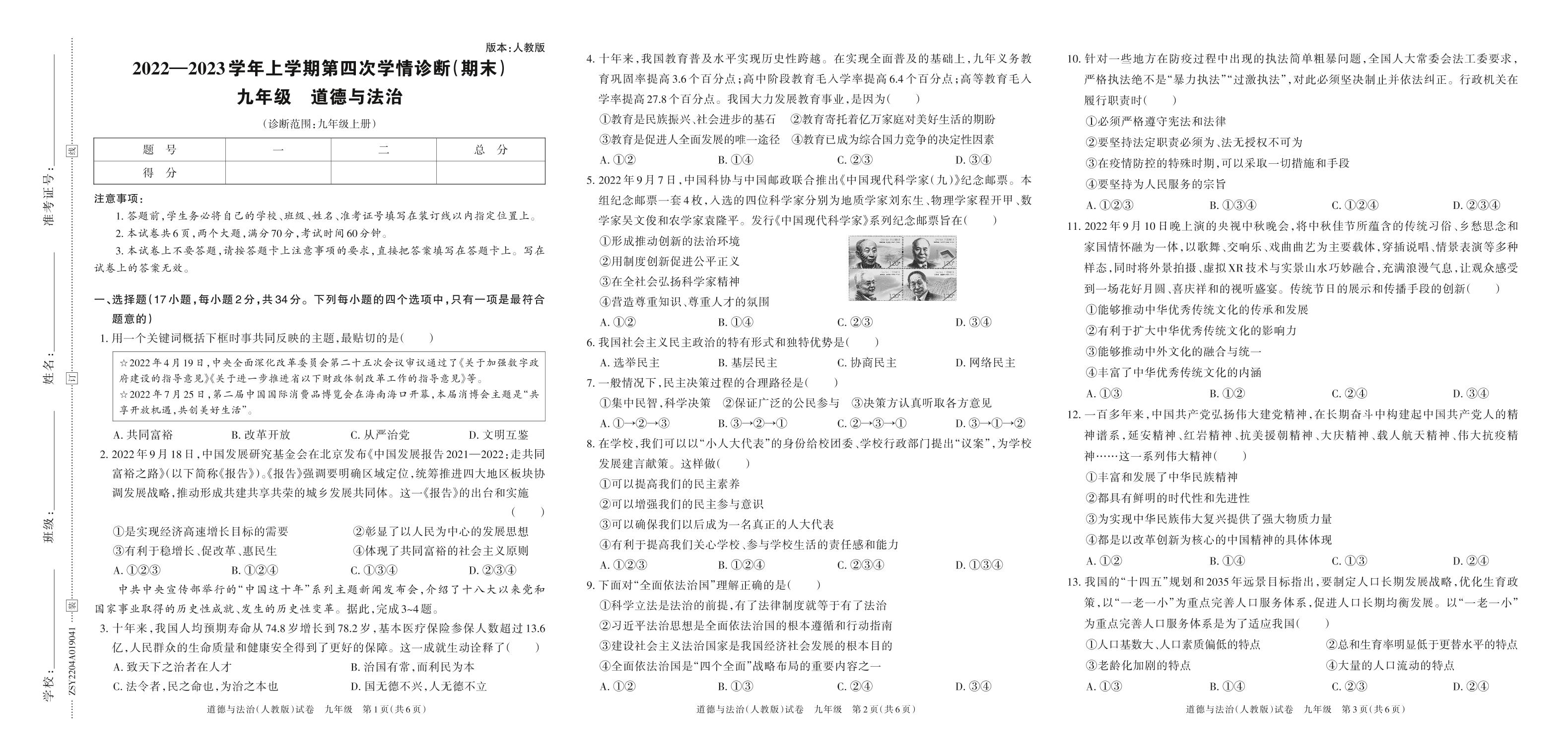 2022—2023学年上学期第四次学情诊断(期末)九年级道德与法治(人教版)