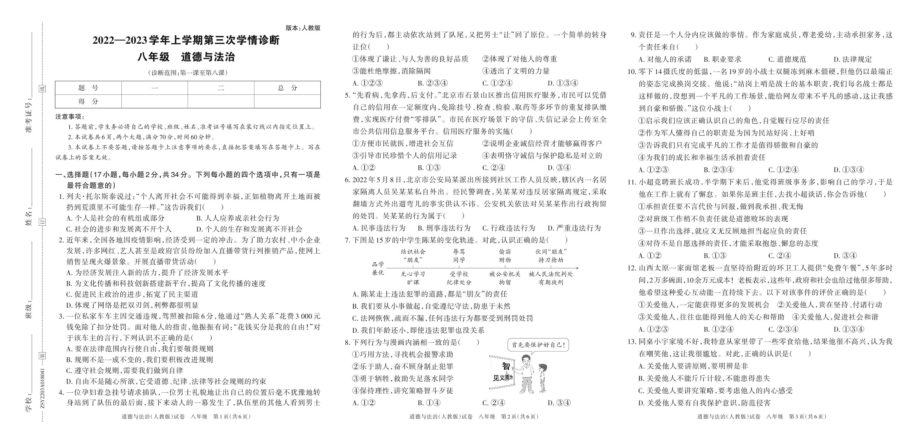 2022—2023学年上学期第三次学情诊八年级断道德与法治(人教版)