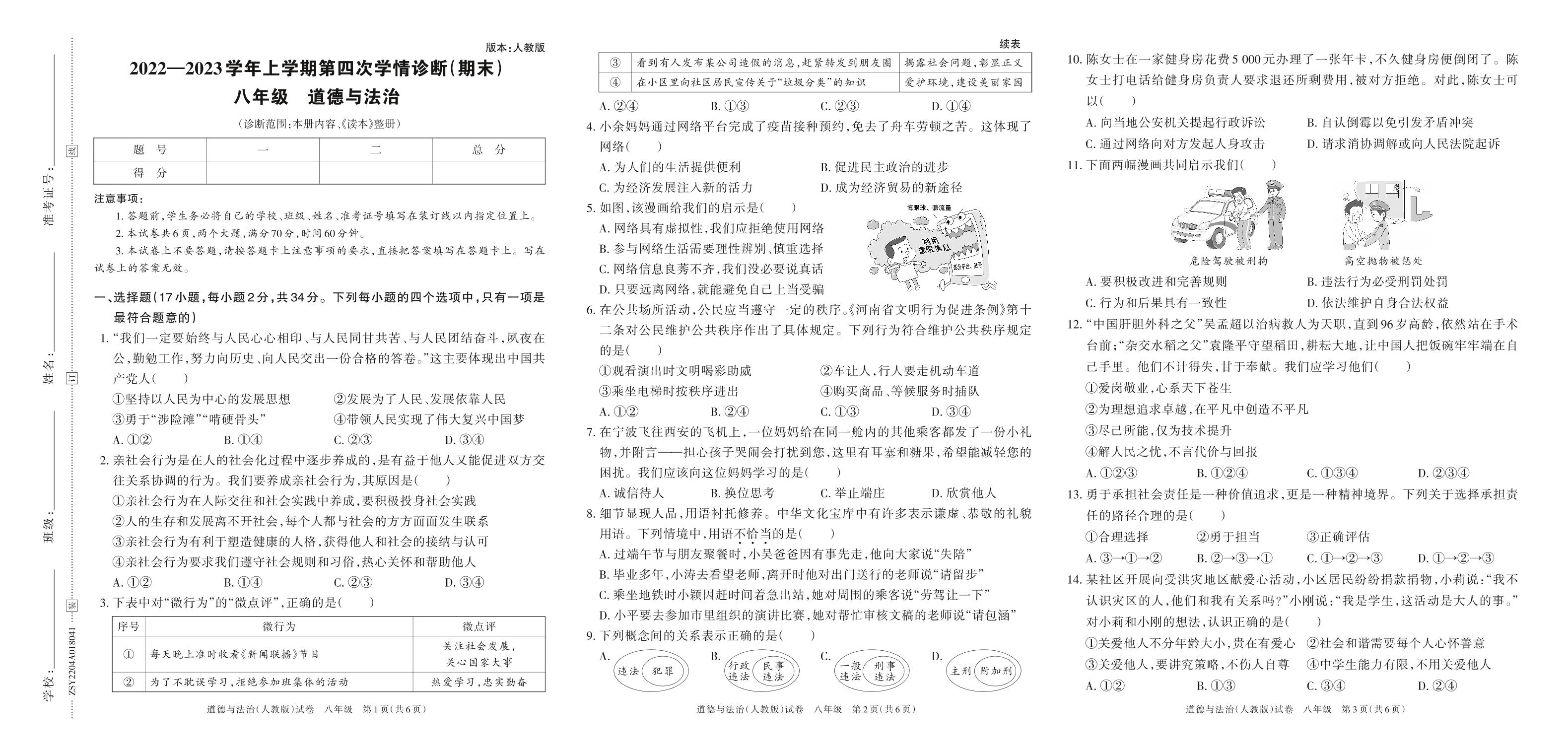 2022—2023学年上学期第四次学情诊断(期末)八年级断道德与法治(人教版)