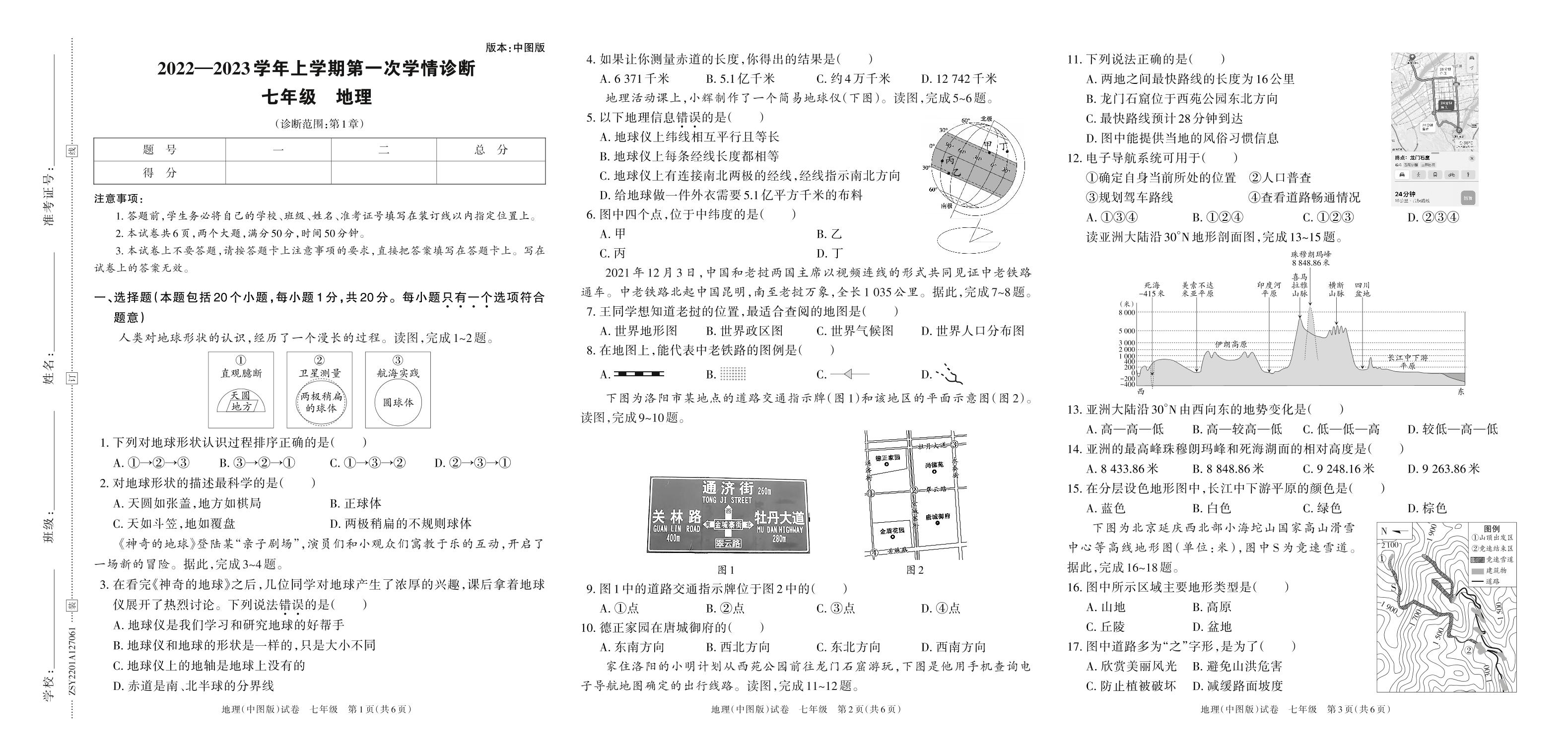 七年级地理中图版上册月考卷