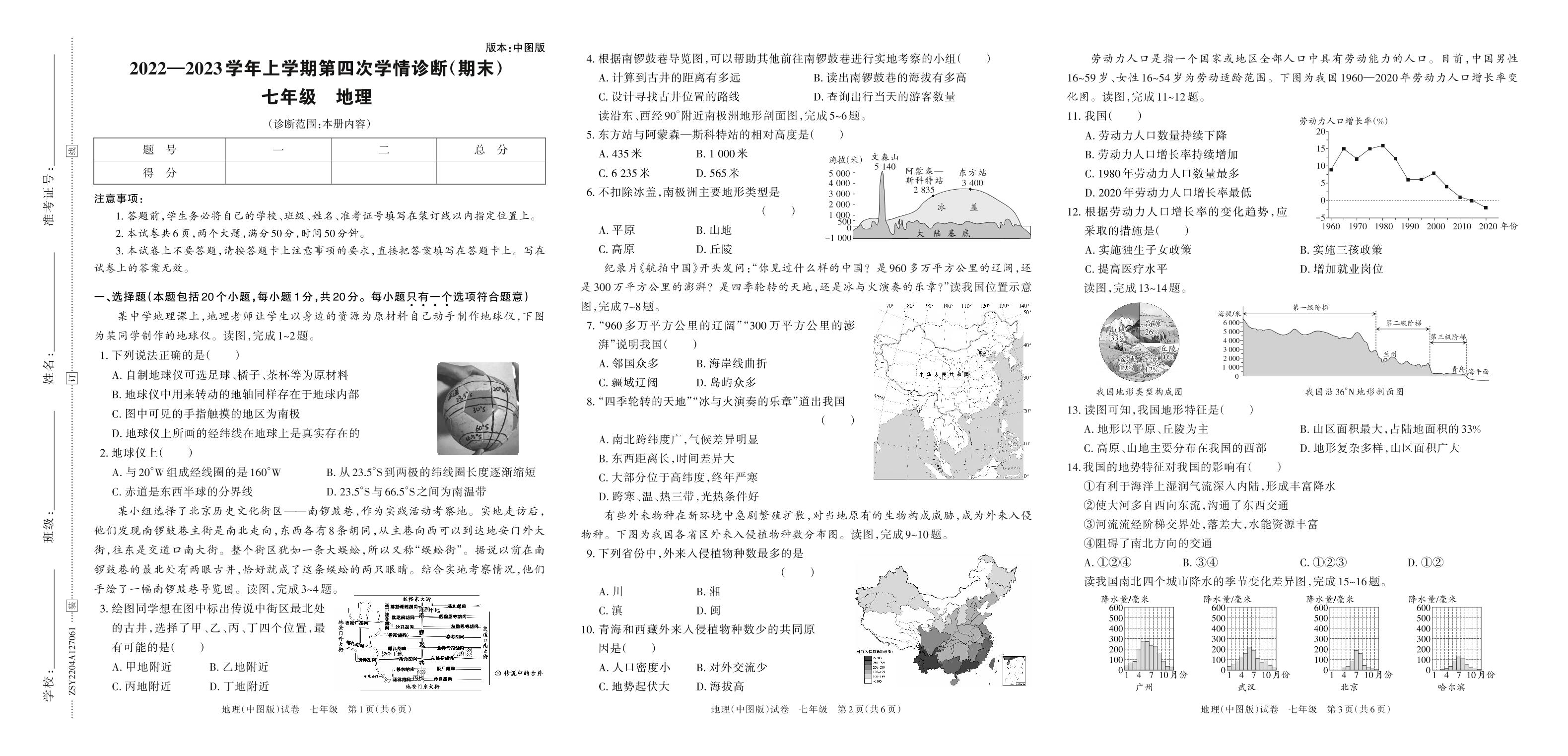 2022—2023学年上学期第四次学情诊断(期末)七年级地理(中图版)