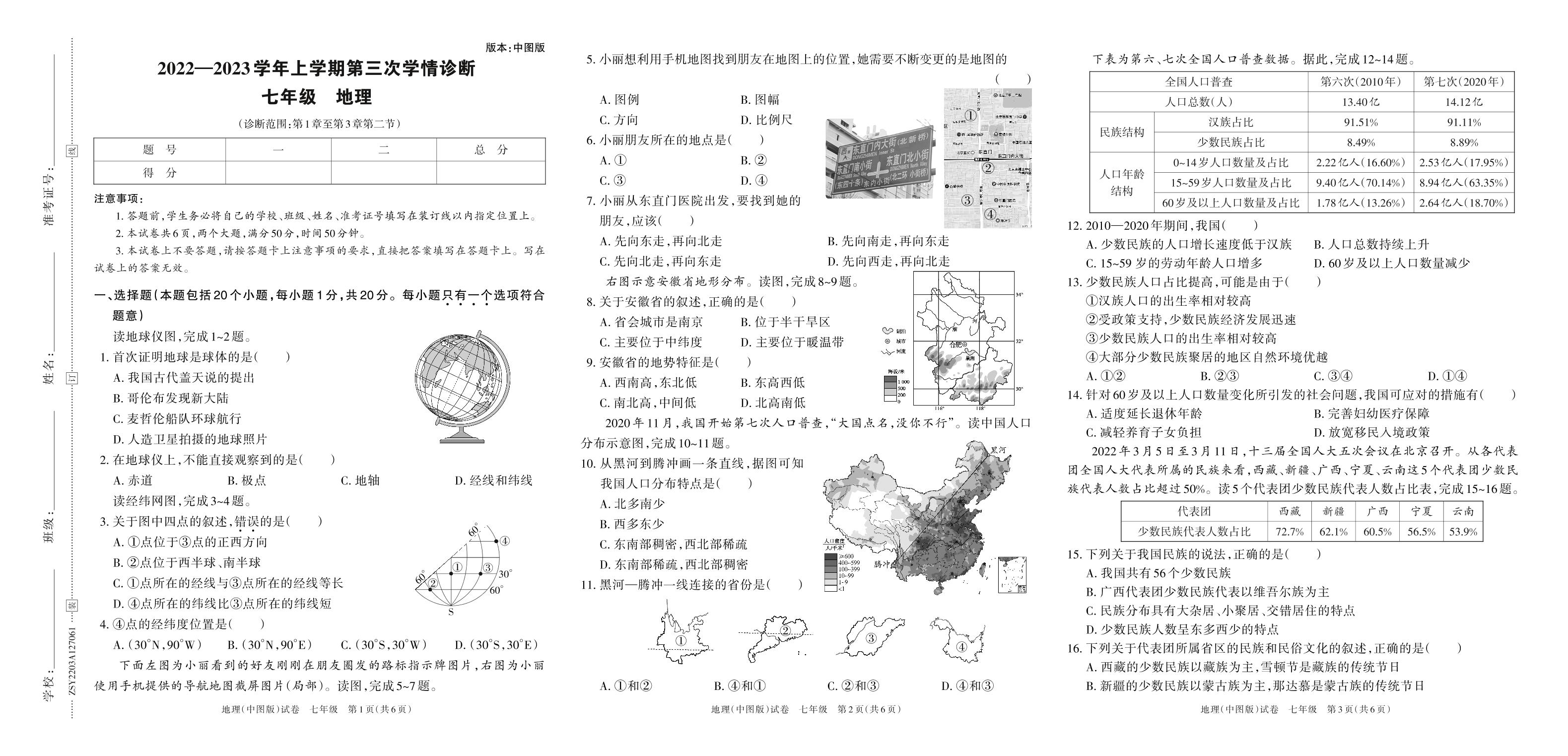 2022—2023学年上学期第三次学情诊断七年级地理(中图版)