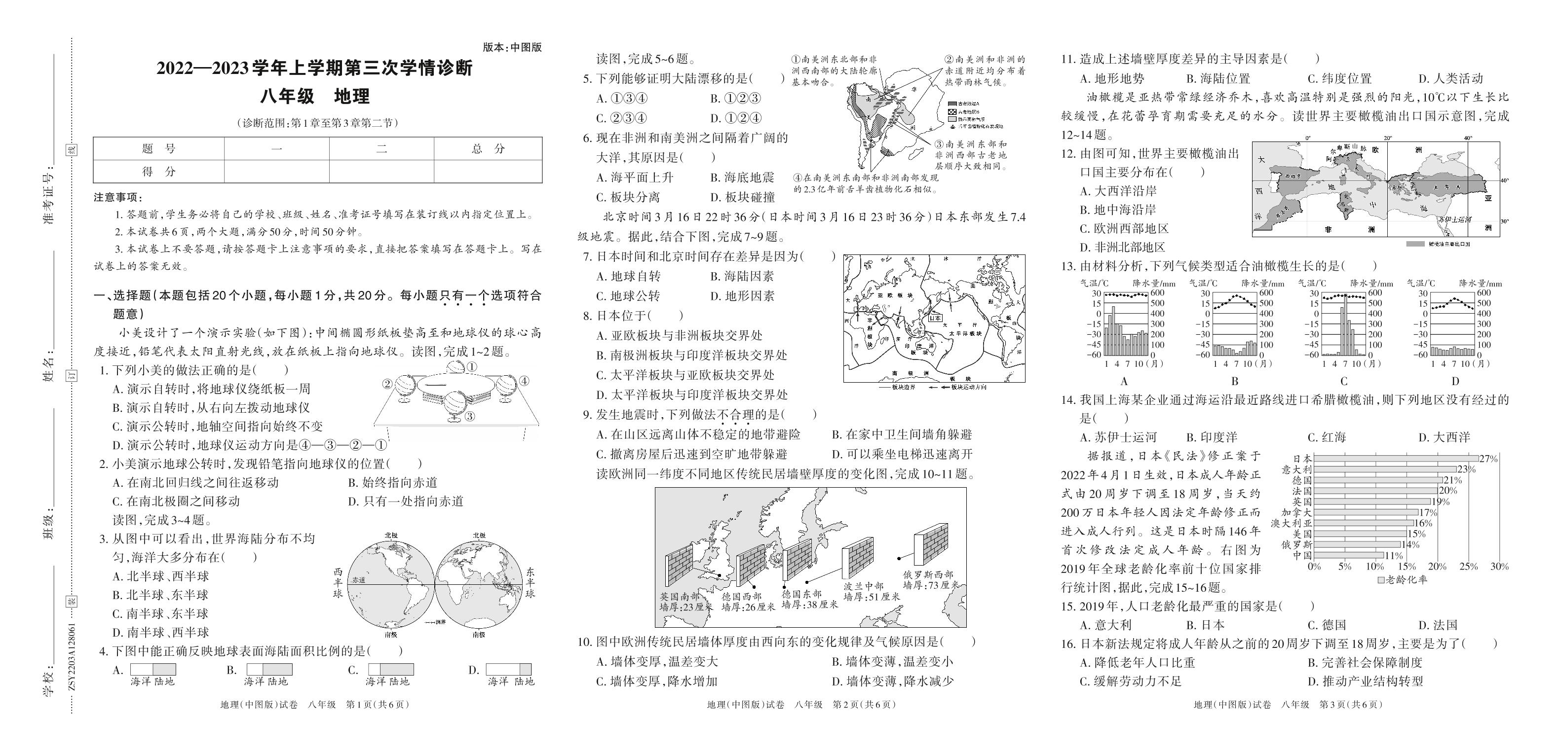 2022—2023学年上学期第三次学情诊断八年级地理(中图版)