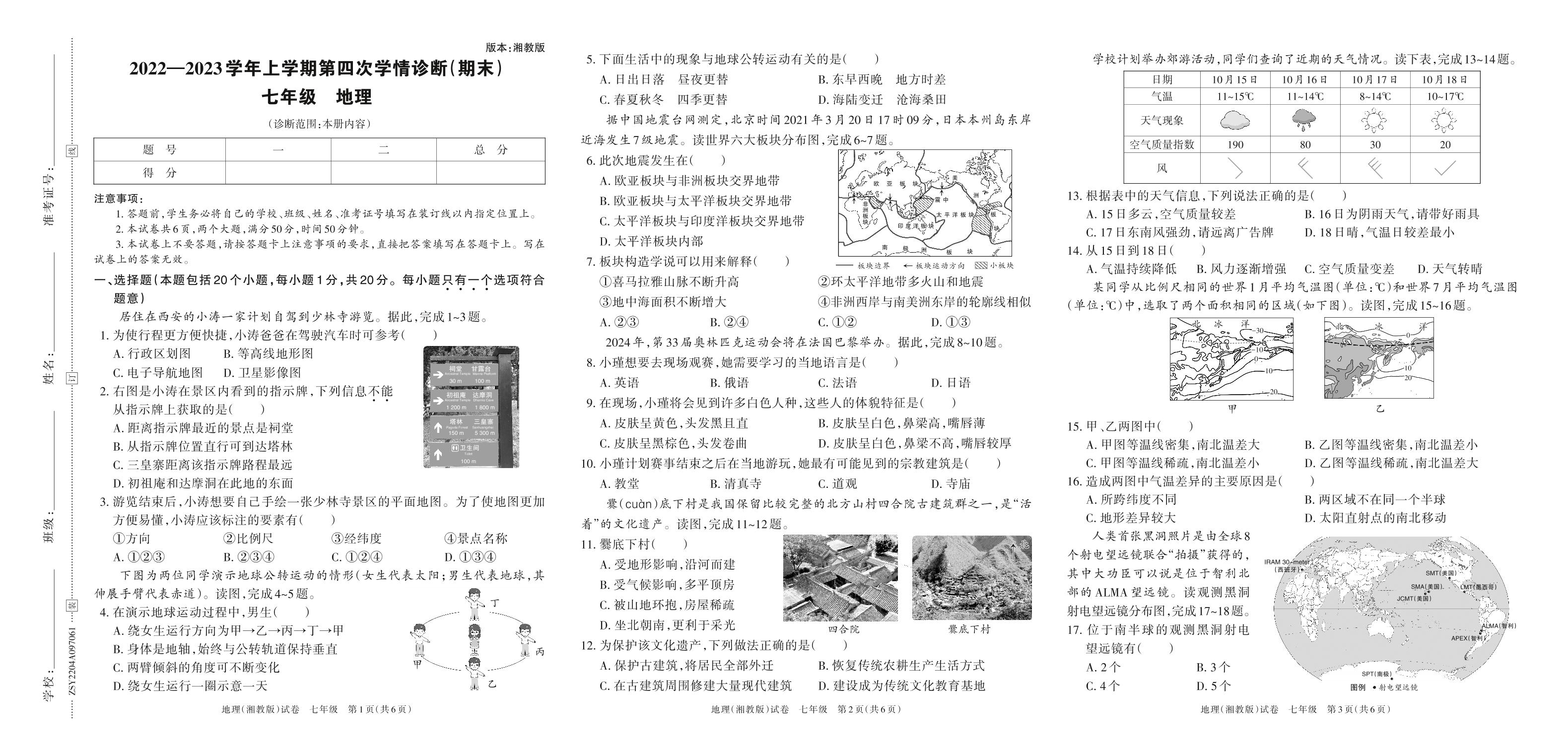 2022—2023学年上学期第四次学情诊断(期末)七年级地理(湘教版)