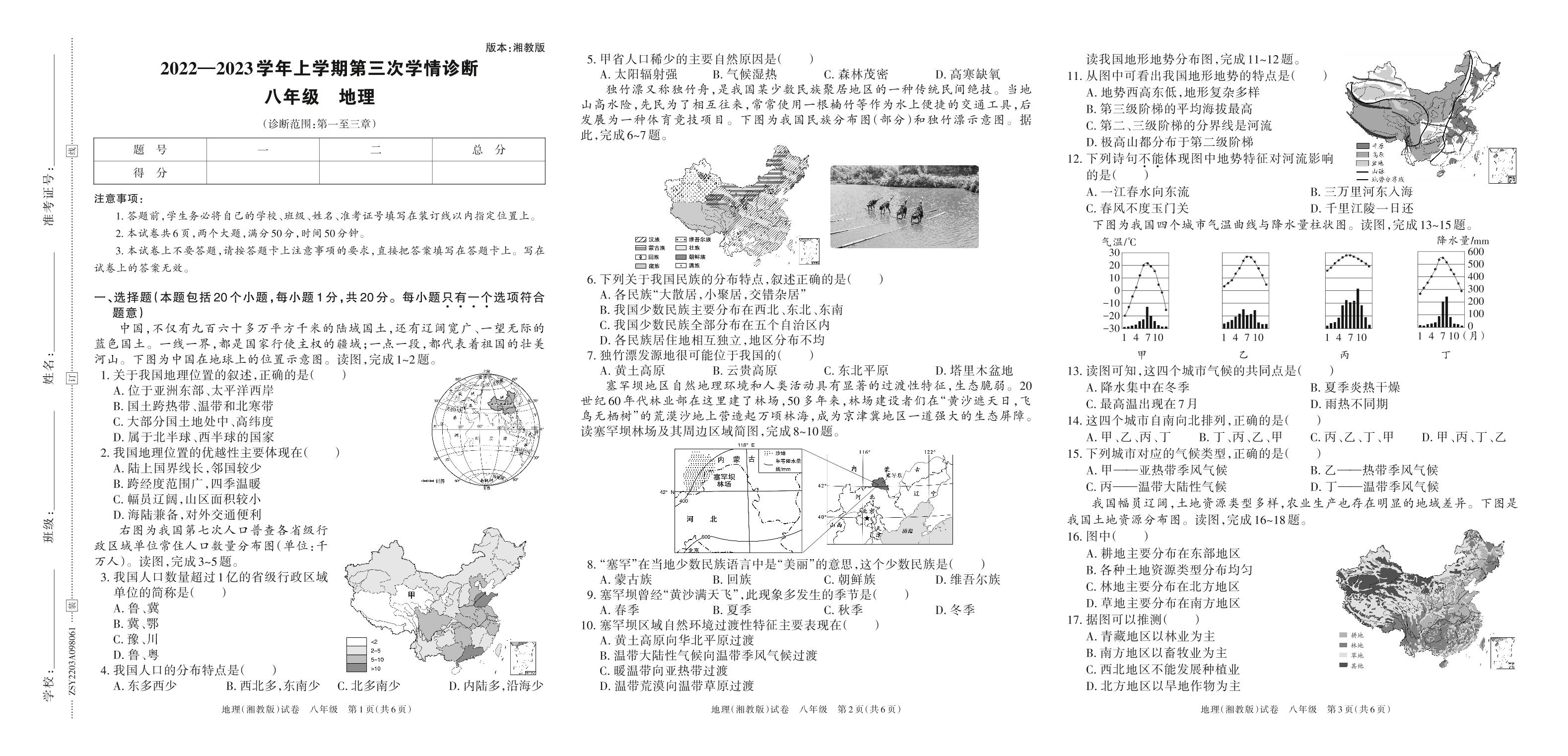 2022—2023学年上学期第三次学情诊断八年级地理(湘教版)