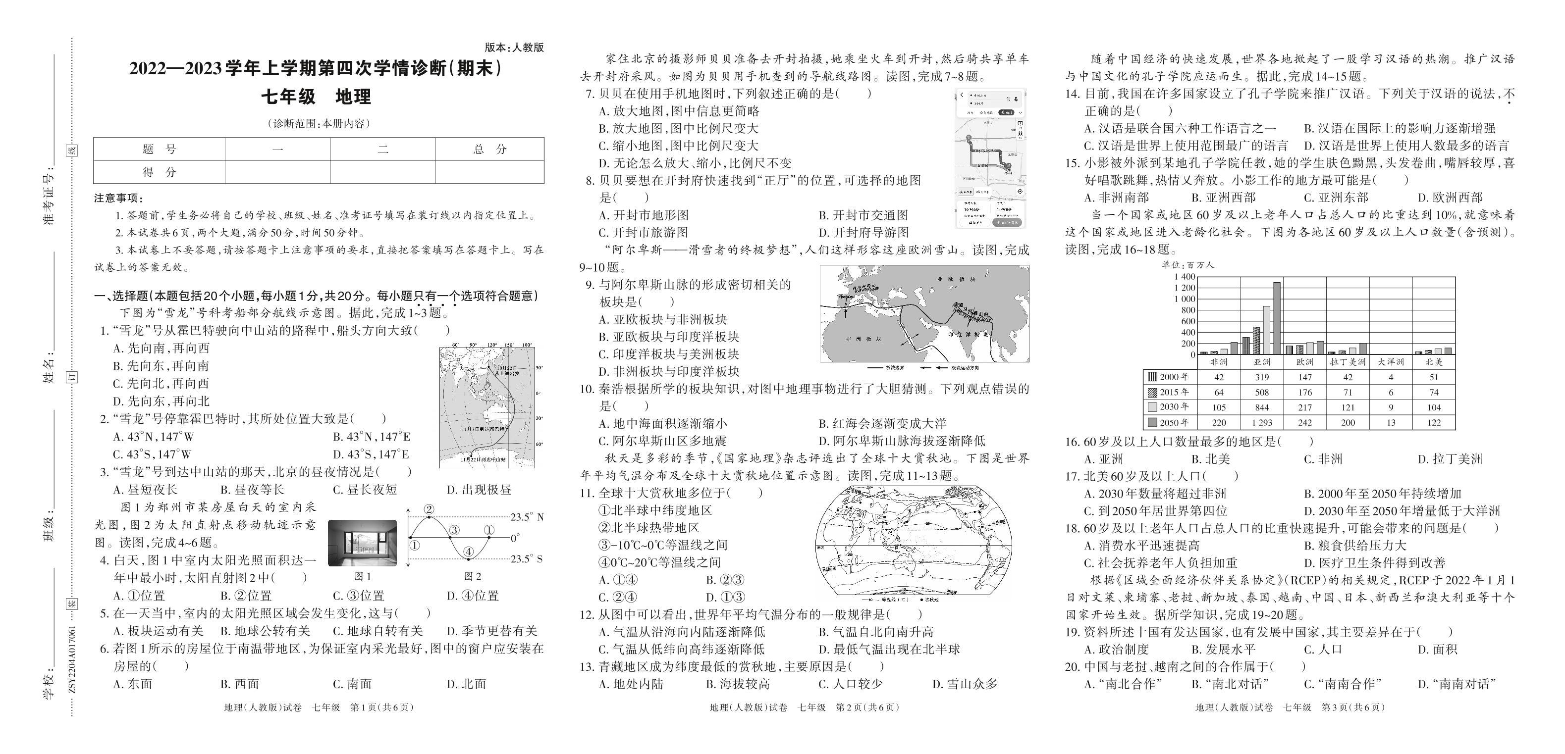 2022—2023学年上学期第四次学情诊断(期末)七年级地理(人教版)