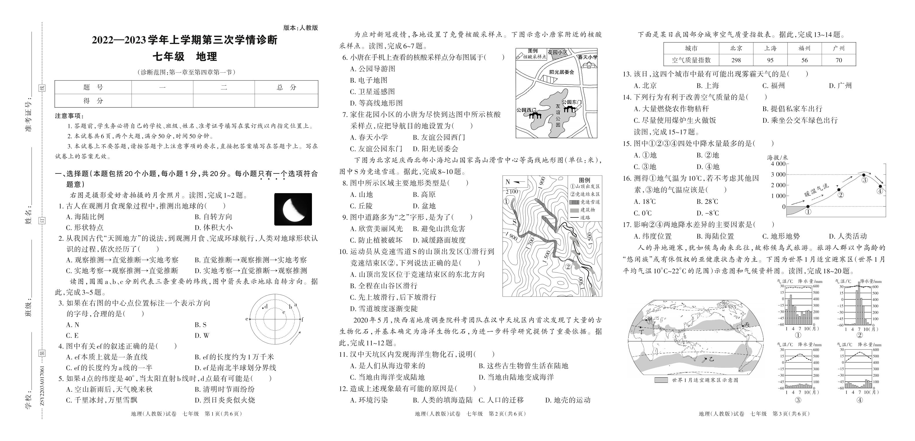 2022—2023学年上学期第三次学情诊断七年级地理(人教版)