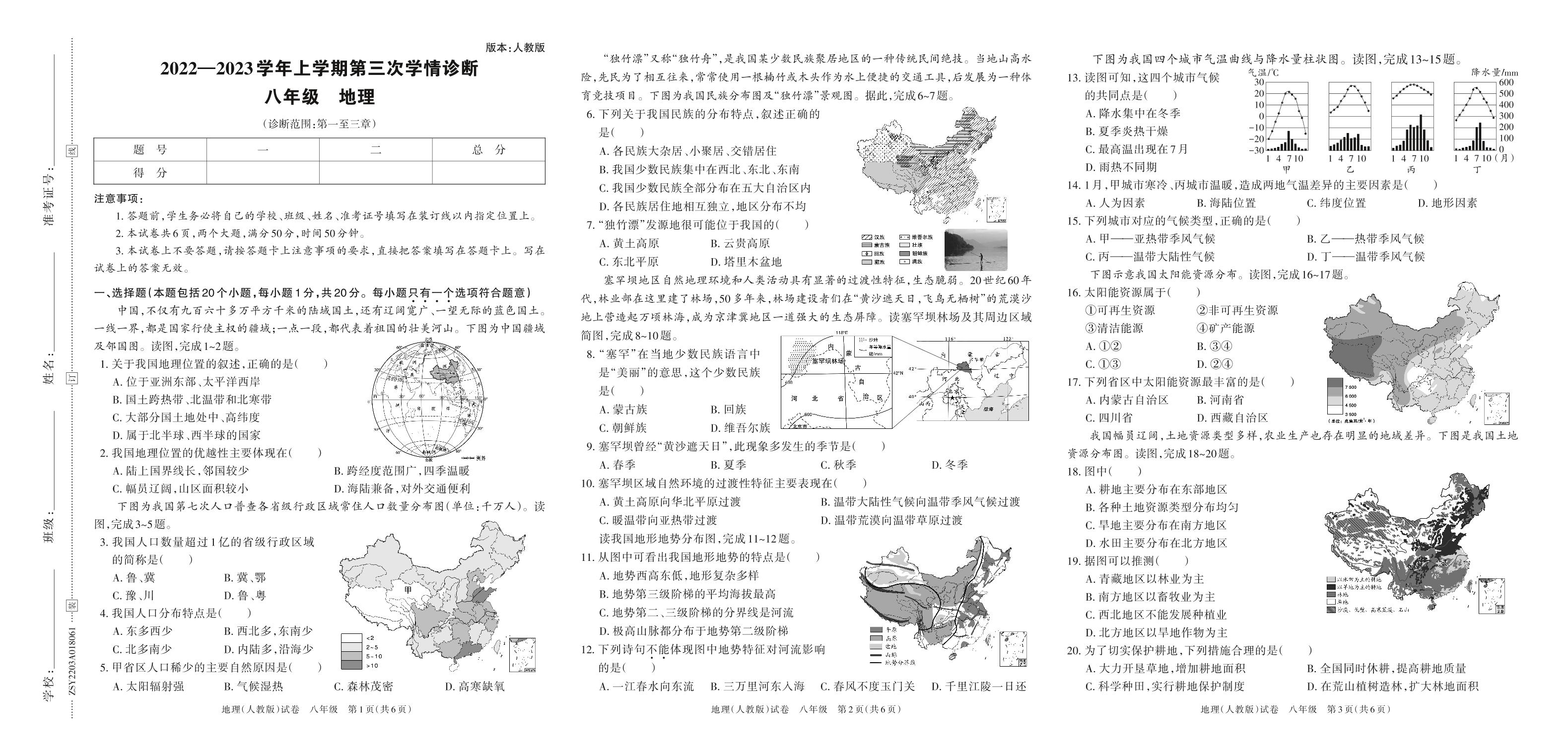2022—2023学年上学期第三次学情诊断八年级地理(人教版)