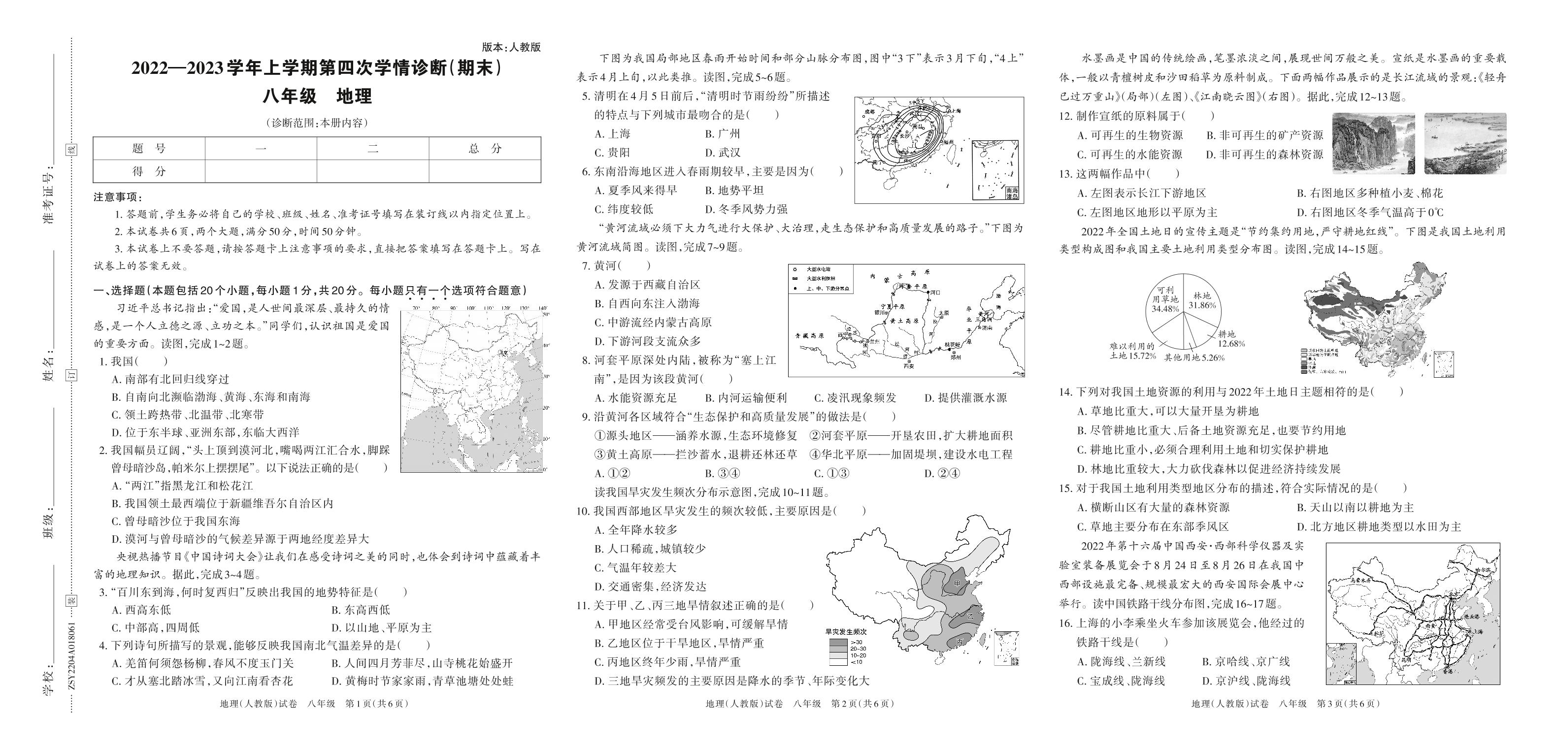 2022—2023学年上学期第四次学情诊断(期末)八年级地理(人教版)