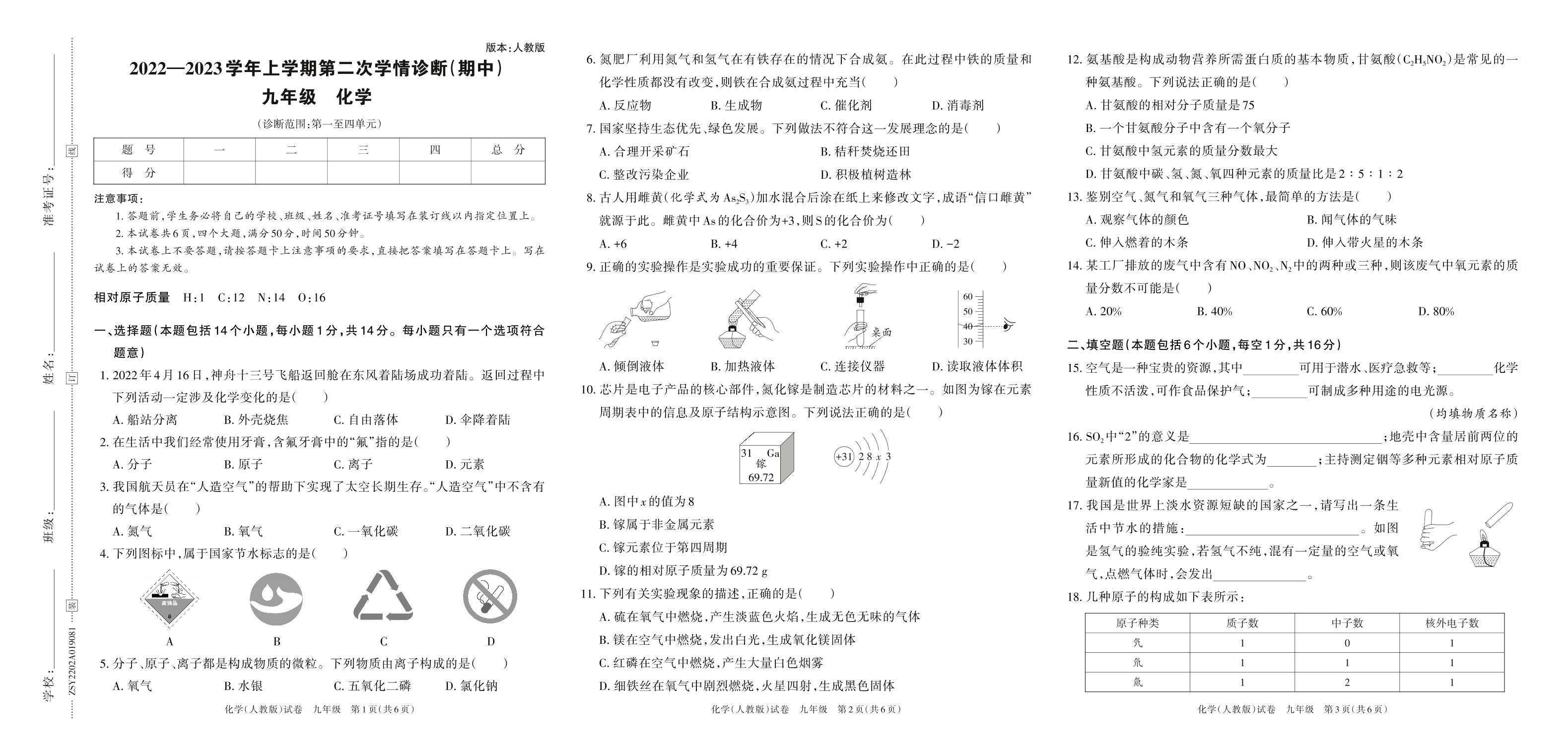2022—2023学年上学期第二次学情诊断(期中)九年级化学(人教版)