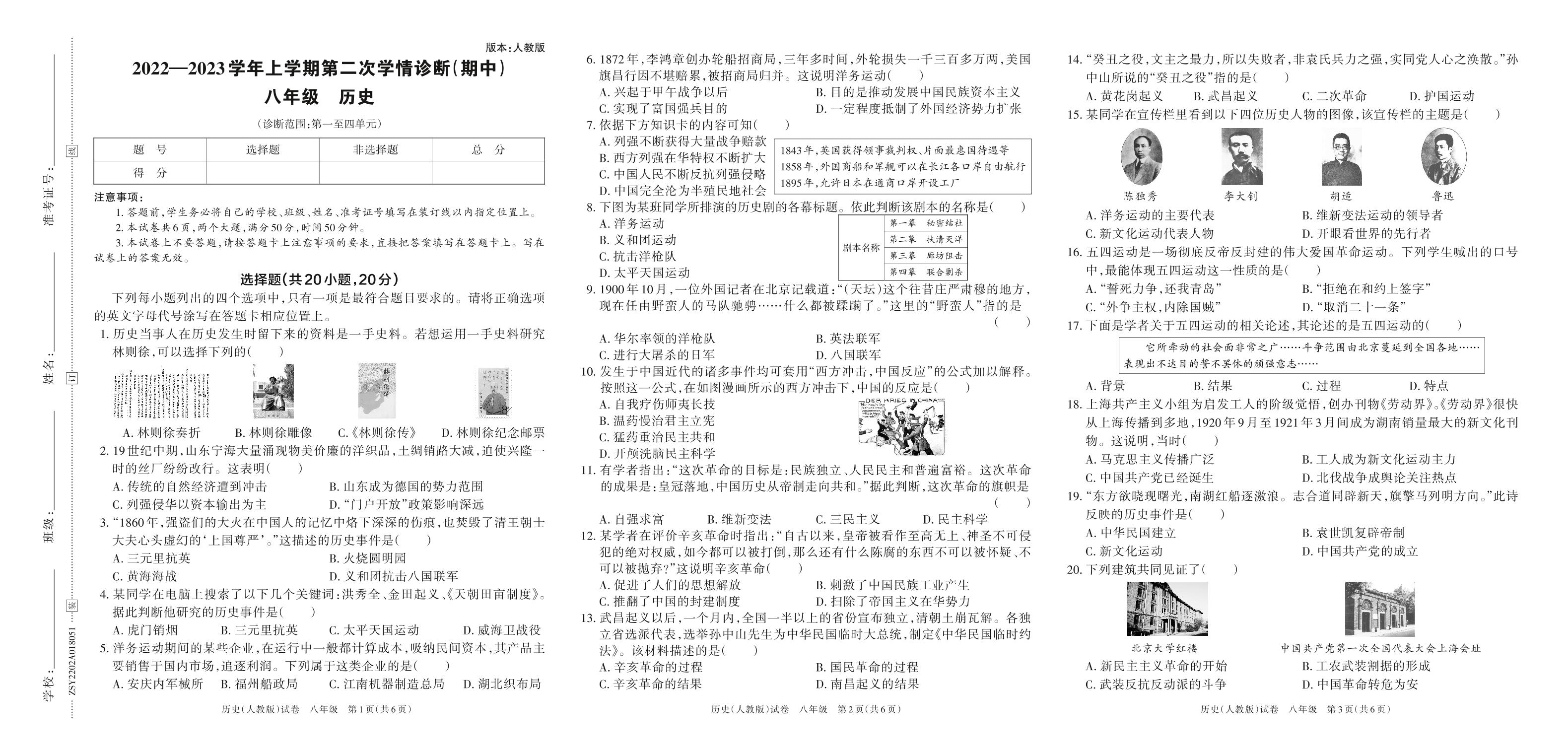 2022—2023学年上学期第二次学情诊断(期中)八年级历史(人教版)