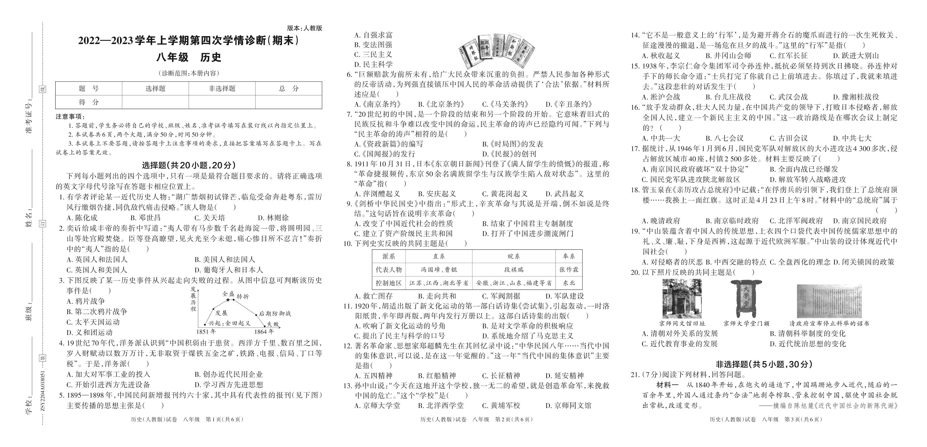 2022—2023学年上学期第四次学情诊断(期末)八年级历史(人教版)