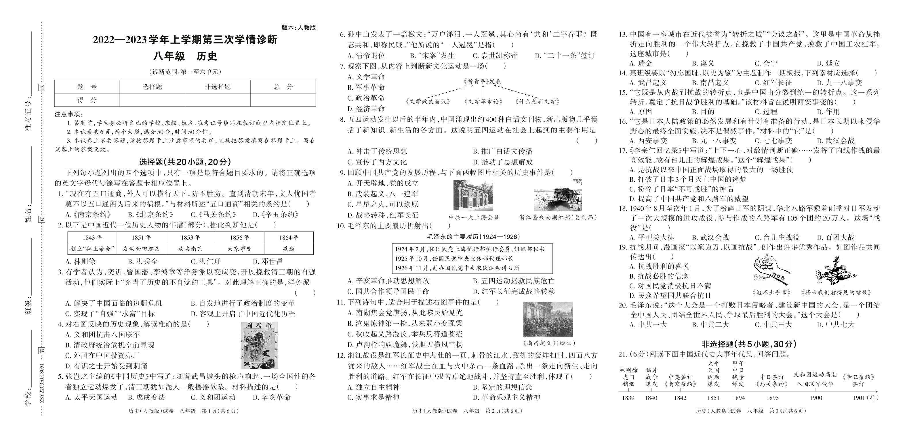 2022—2023学年上学期第三次学情诊断八年级历史(人教版)
