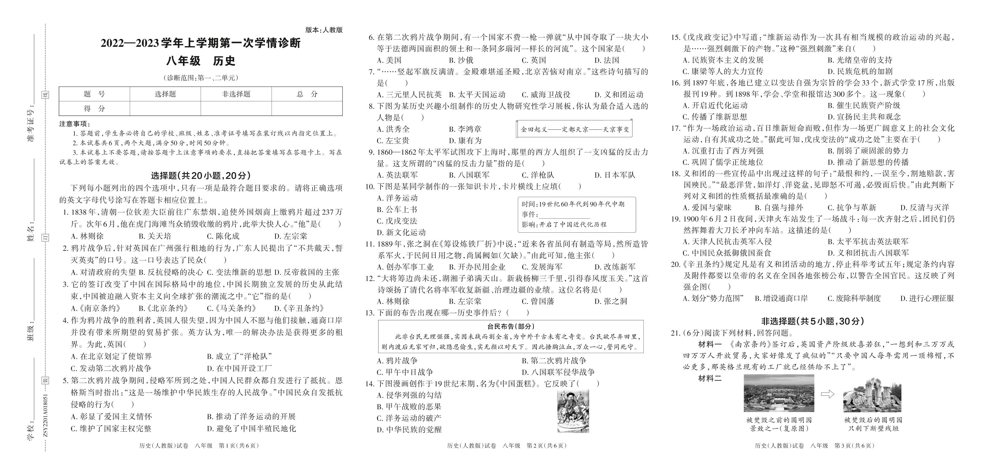2022—2023学年上学期第一次学情诊断八年级历史(人教版)