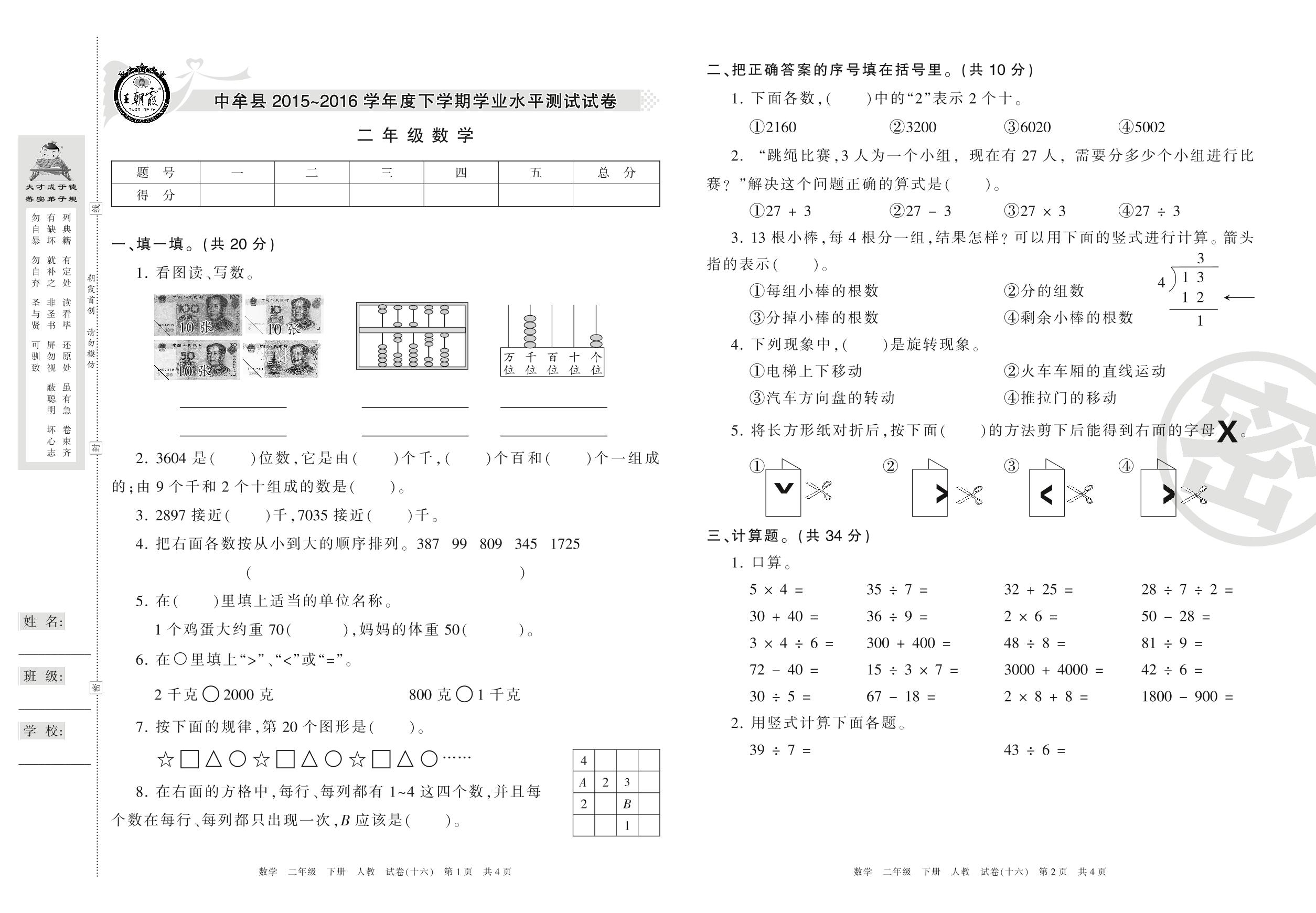 2015-2016学年第二学期郑州市中牟县二年级数学试卷(人教版)【16】