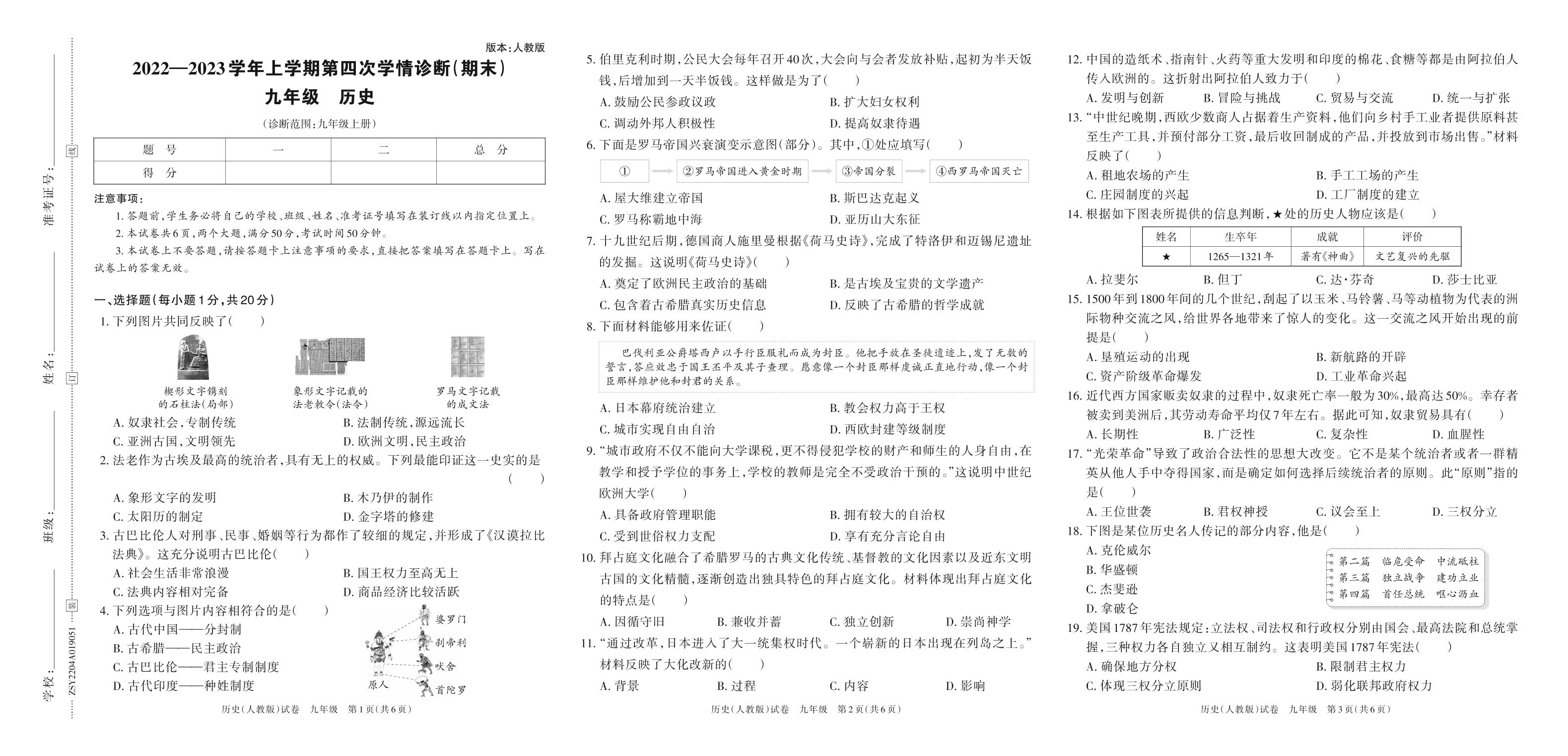 2022—2023学年上学期第四次学情诊断(期末)九年级历史(人教版)