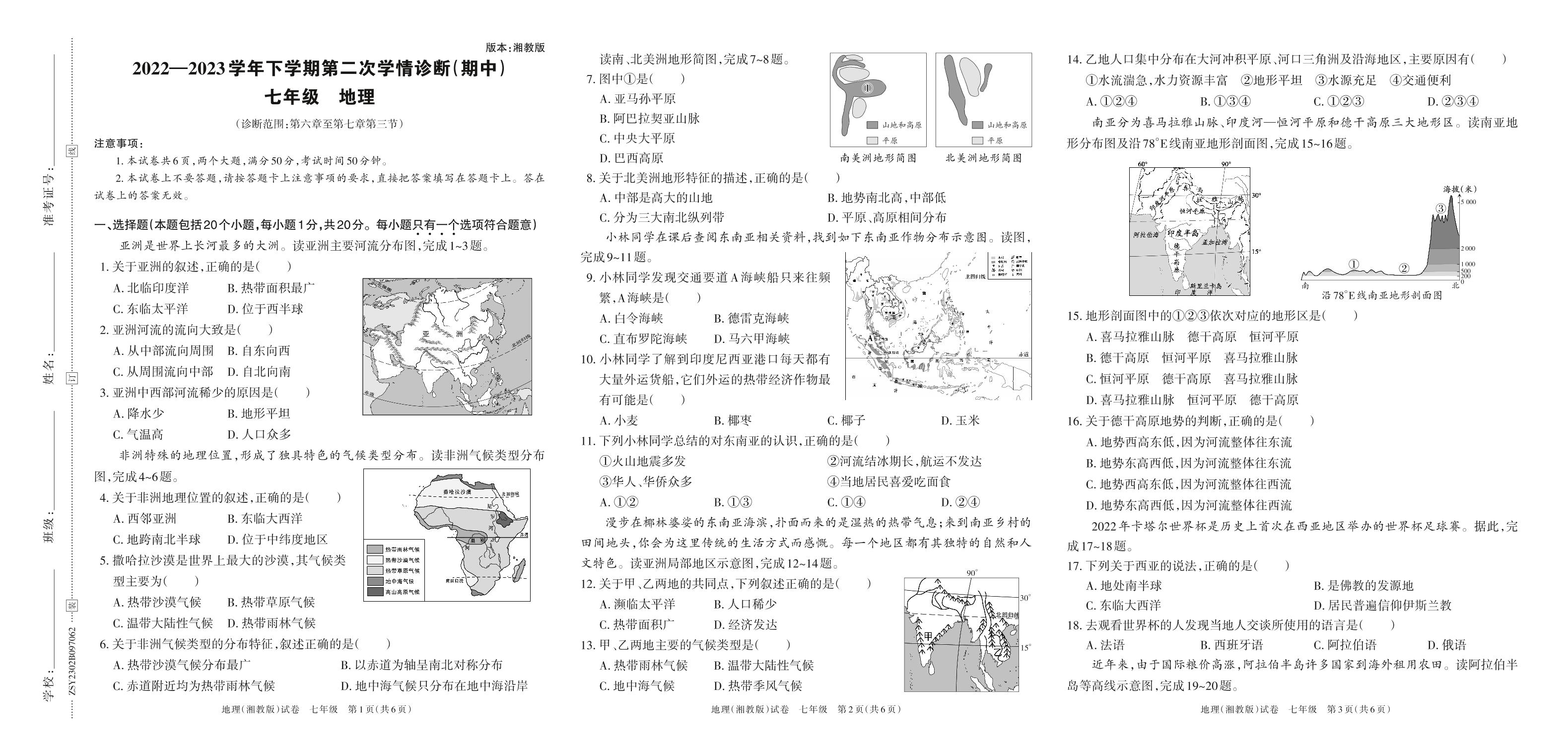 2022—2023学年下学期第二次学情诊断(期中)B卷七年级地理(湘教版)