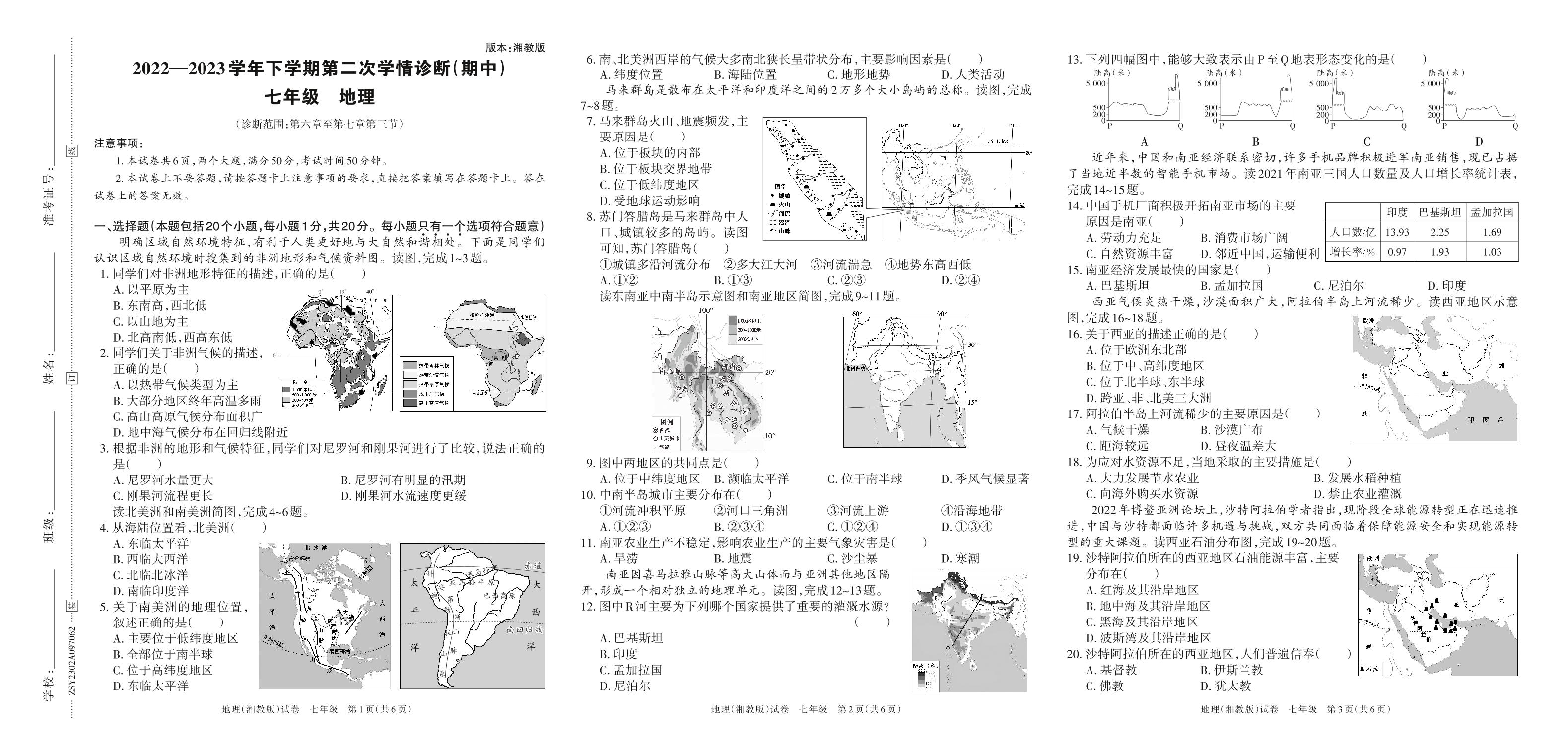 2022—2023学年下学期第二次学情诊断(期中)A卷七年级地理(湘教版)