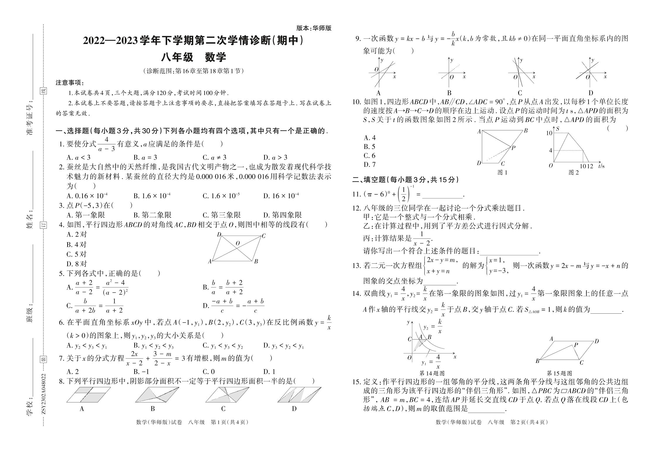 2022—2023学年下学期第二次学情诊断(期中)A卷八年级数学(华师版)
