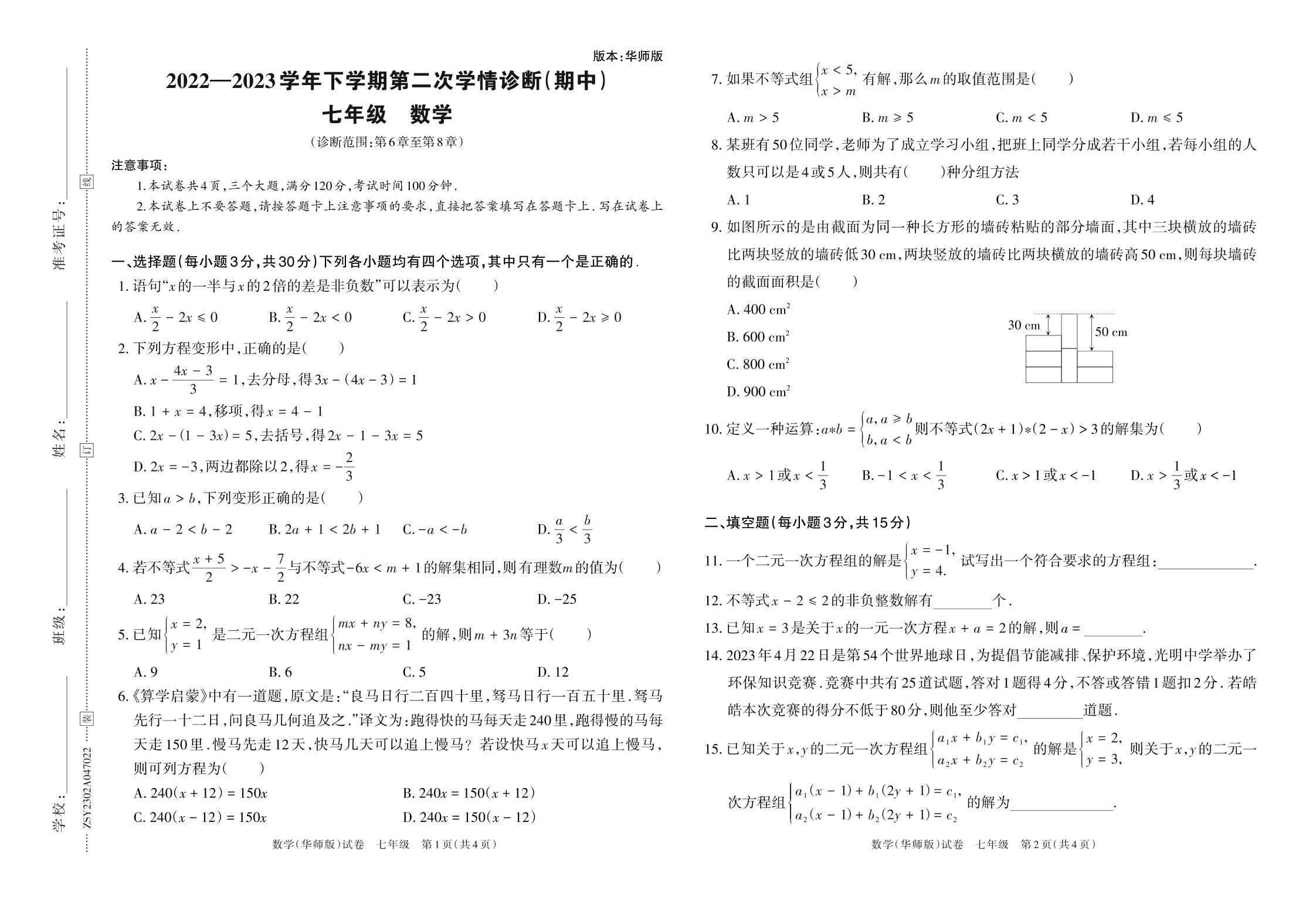 2022—2023学年下学期第二次学情诊断(期中)A卷七年级数学(华师版)