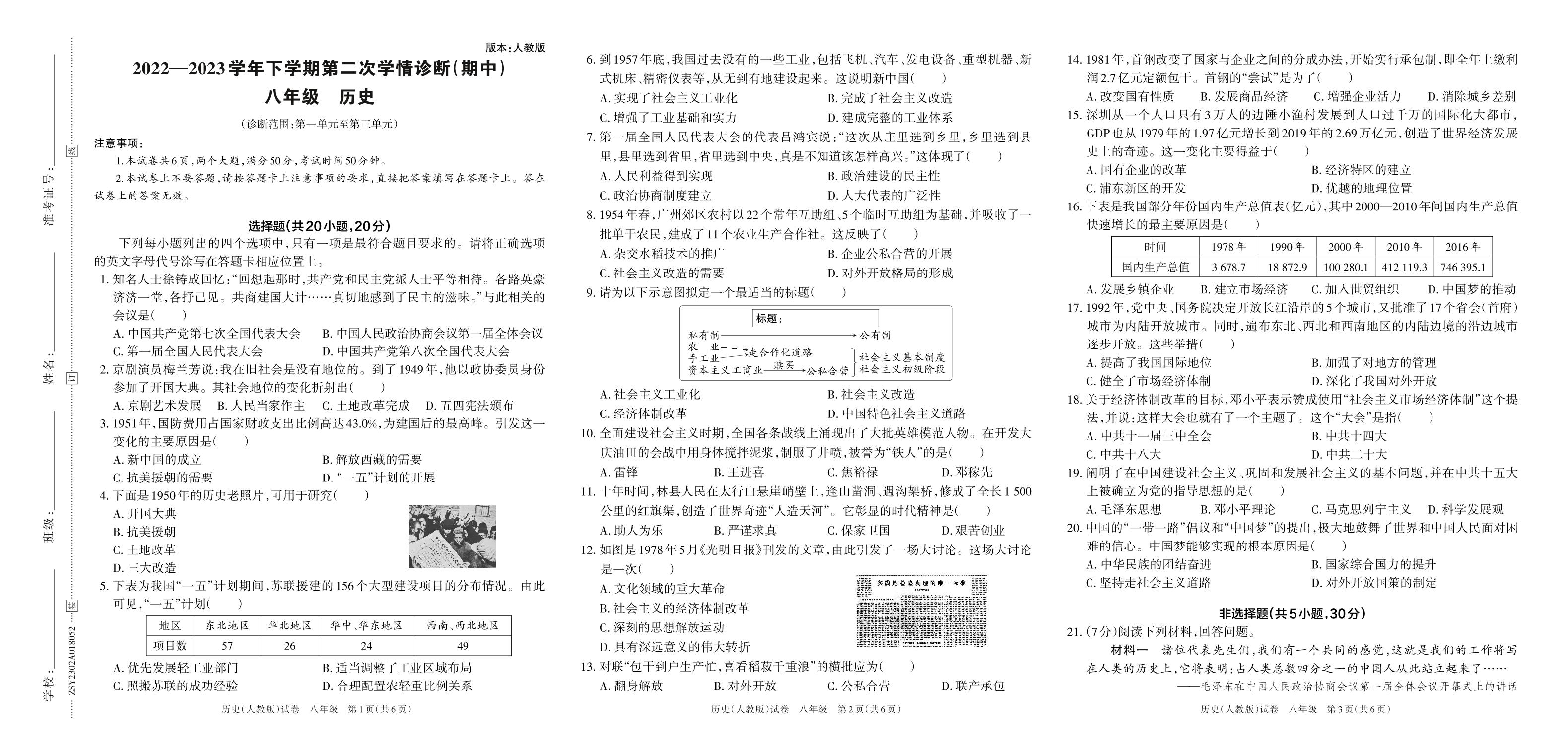 2022—2023学年下学期第二次学情诊断(期中)A卷八年级历史(人教版)