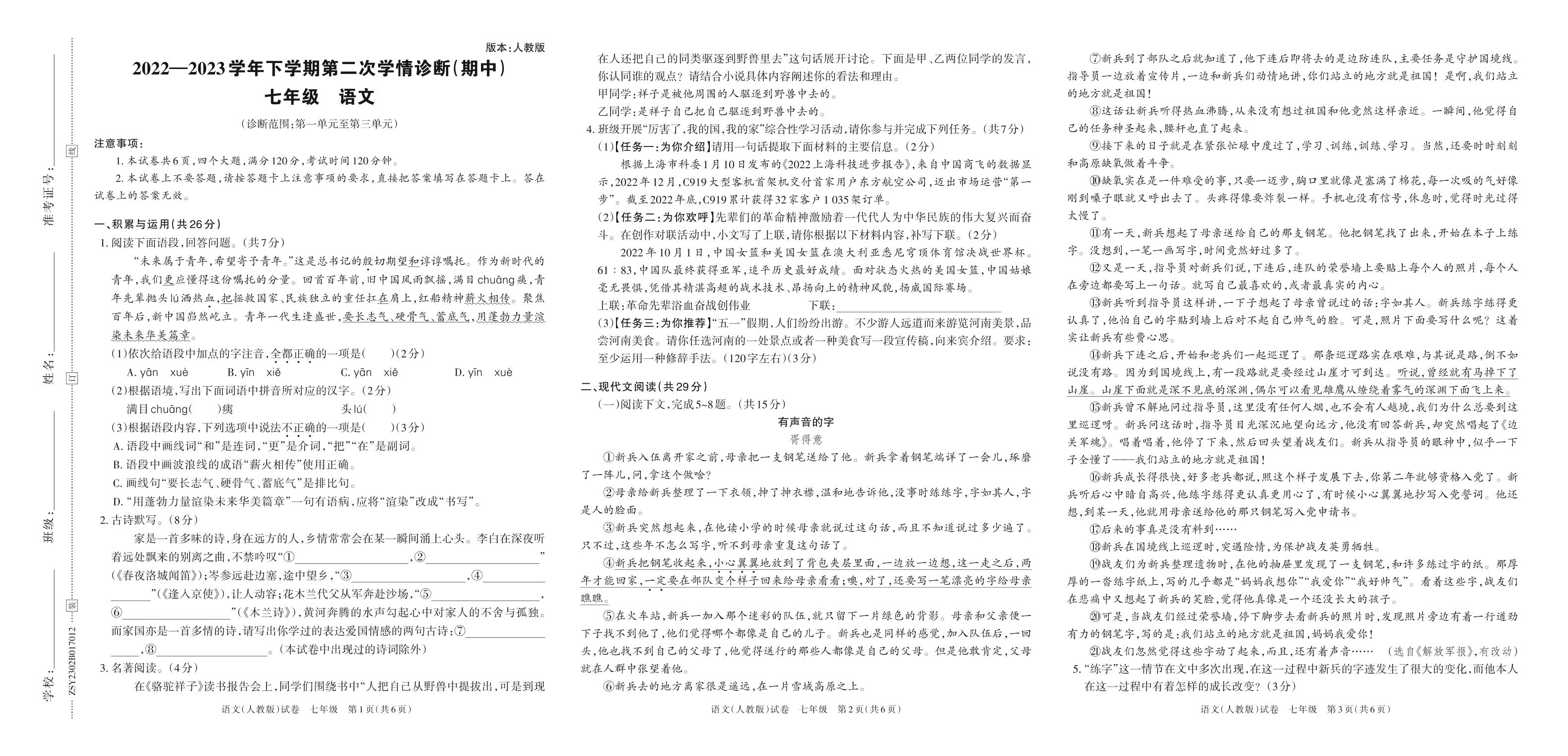 2022—2023学年下学期第二次学情诊断(期中)B卷七年级语文(人教版)