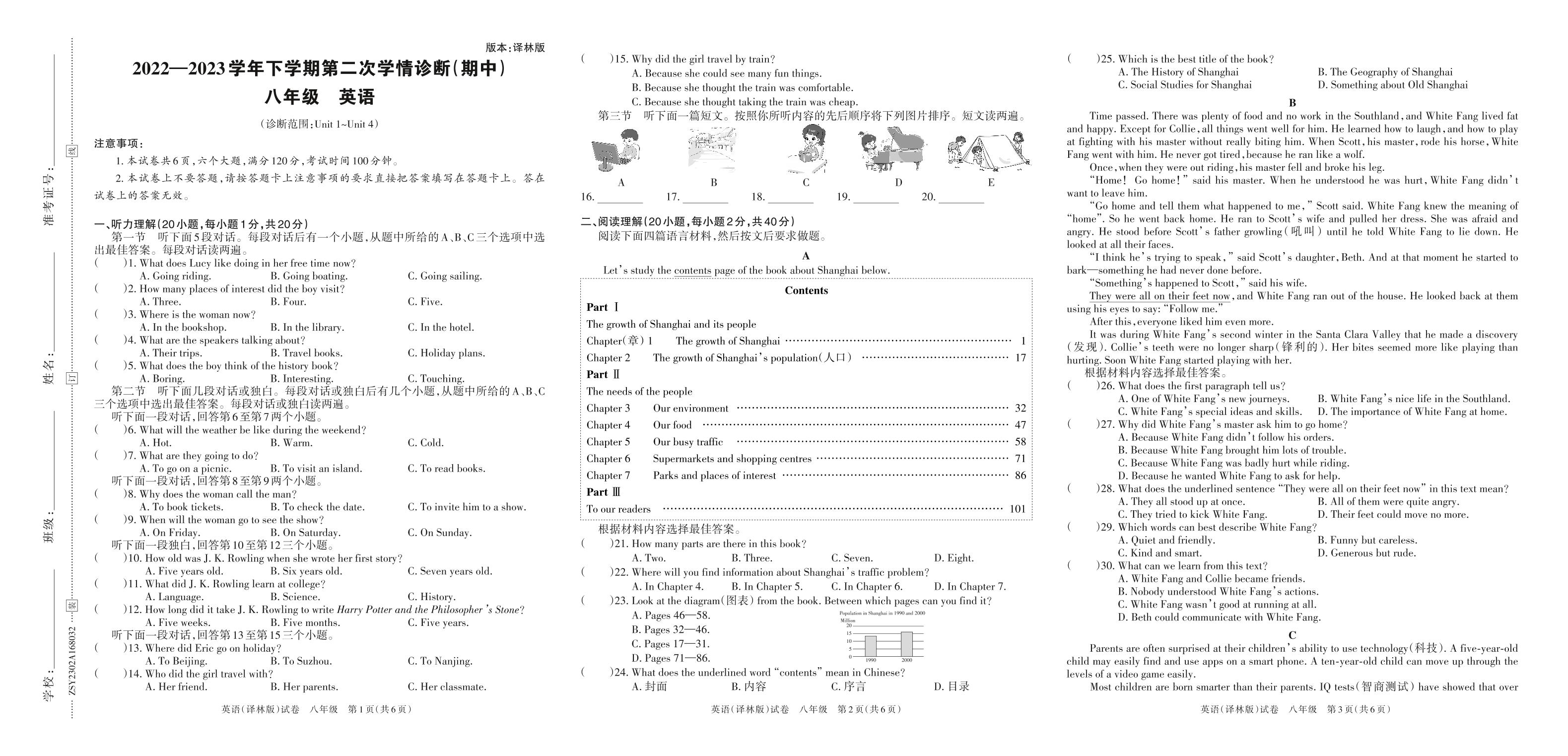 2022—2023学年下学期第二次学情诊断(期中)试卷八年级英语(译林版)