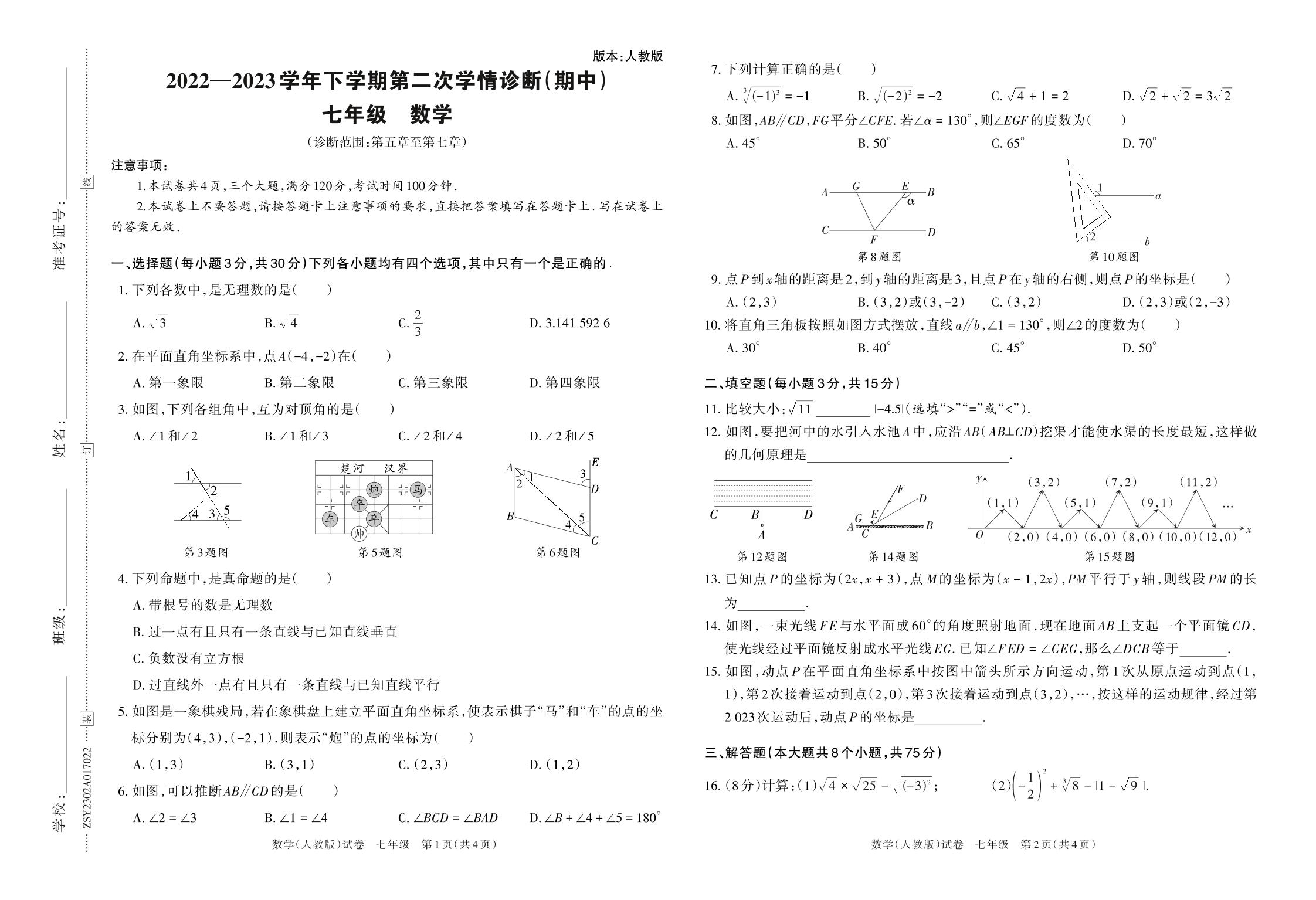 2022—2023学年下学期第二次学情诊断(期中)A卷七年级数学(人教版)