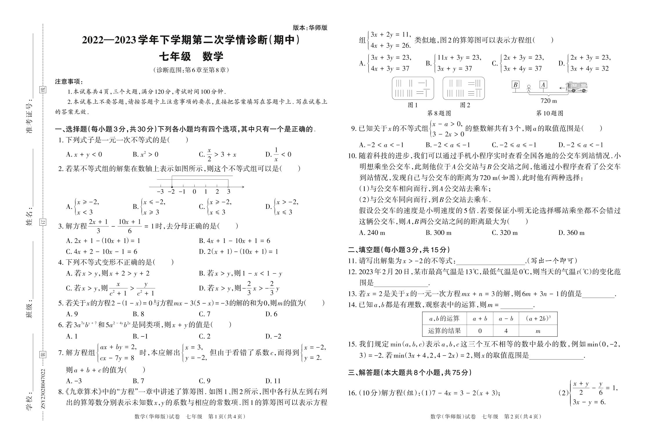 2022—2023学年下学期第二次学情诊断(期中)B卷七年级数学(华师版)